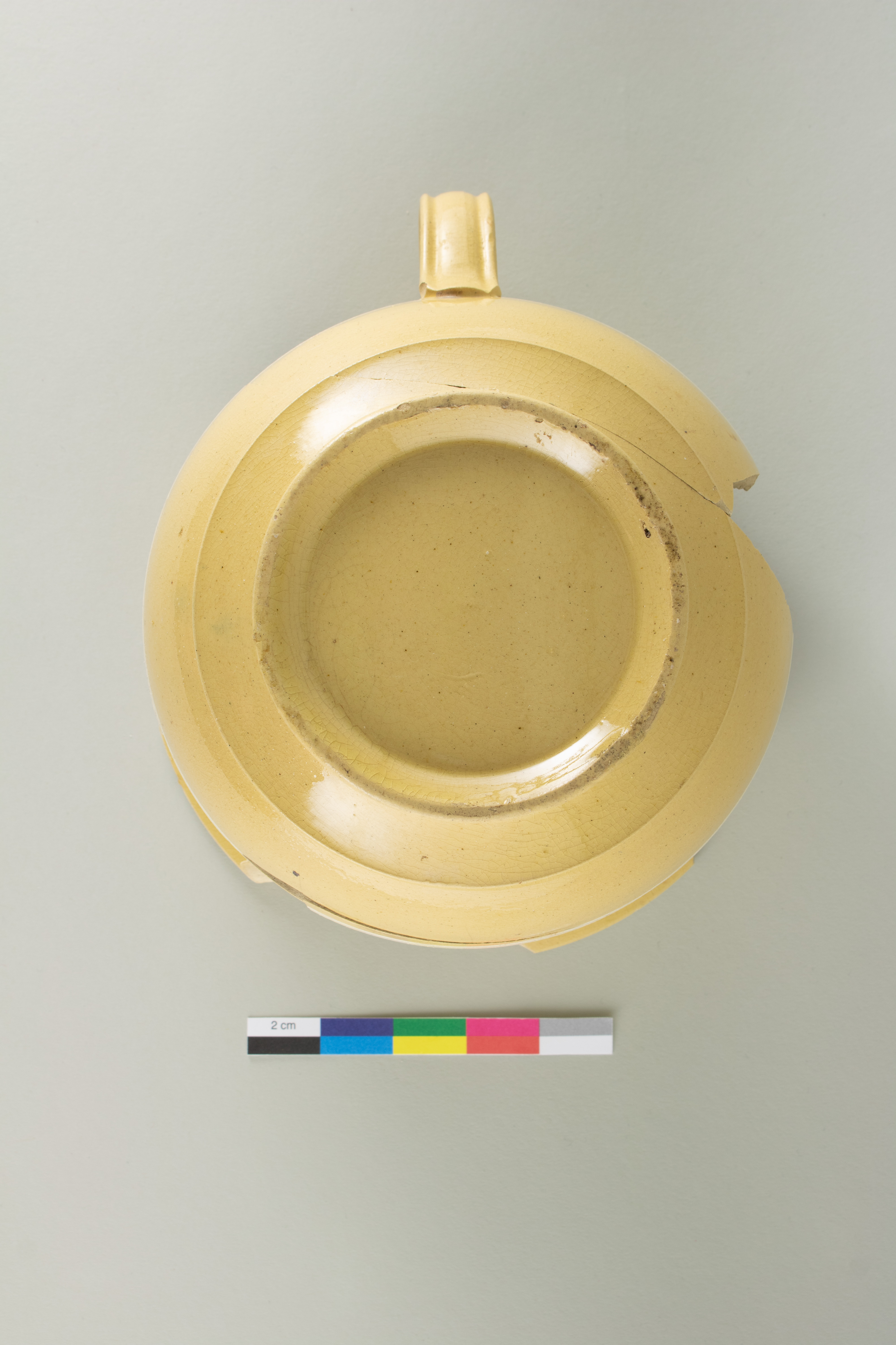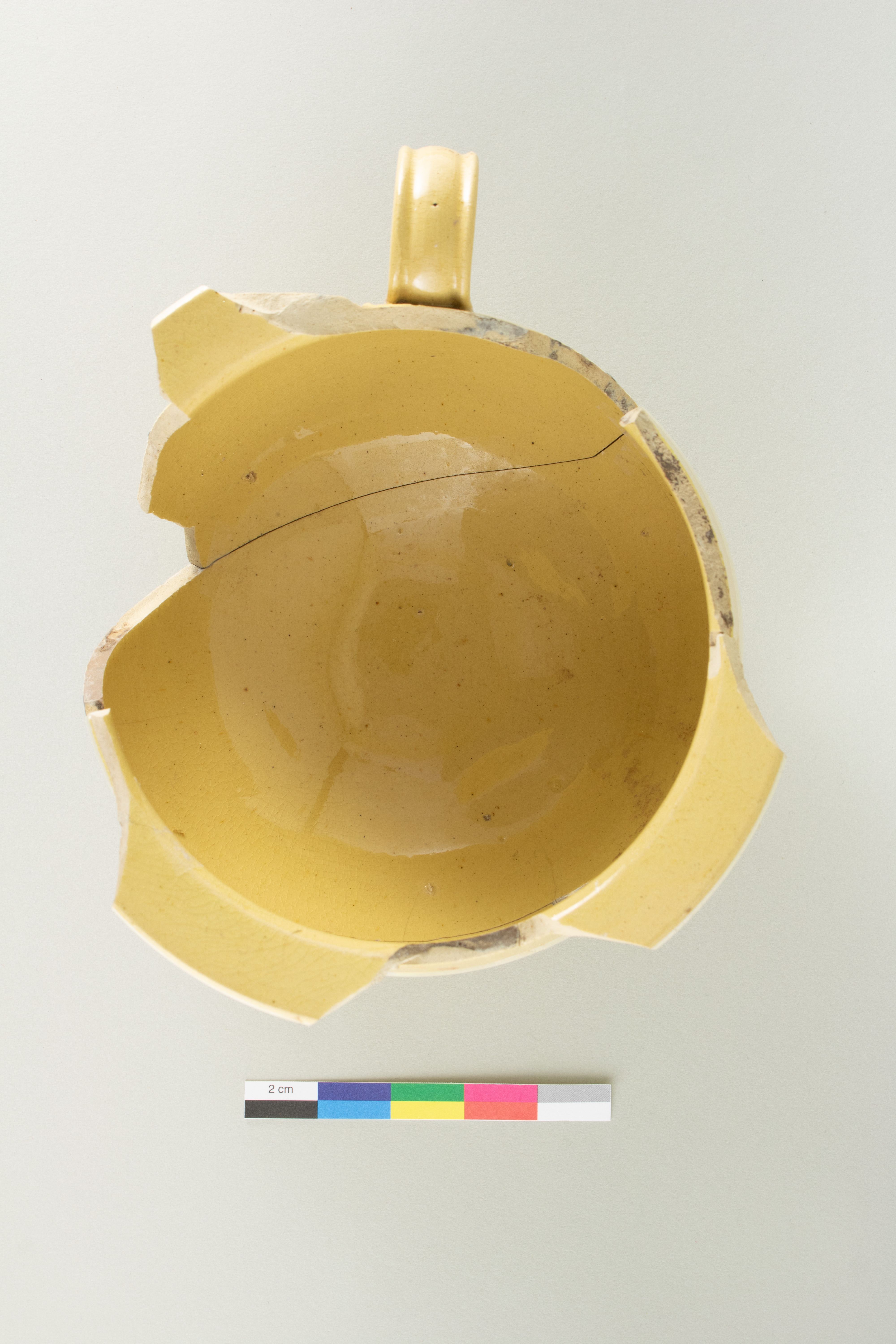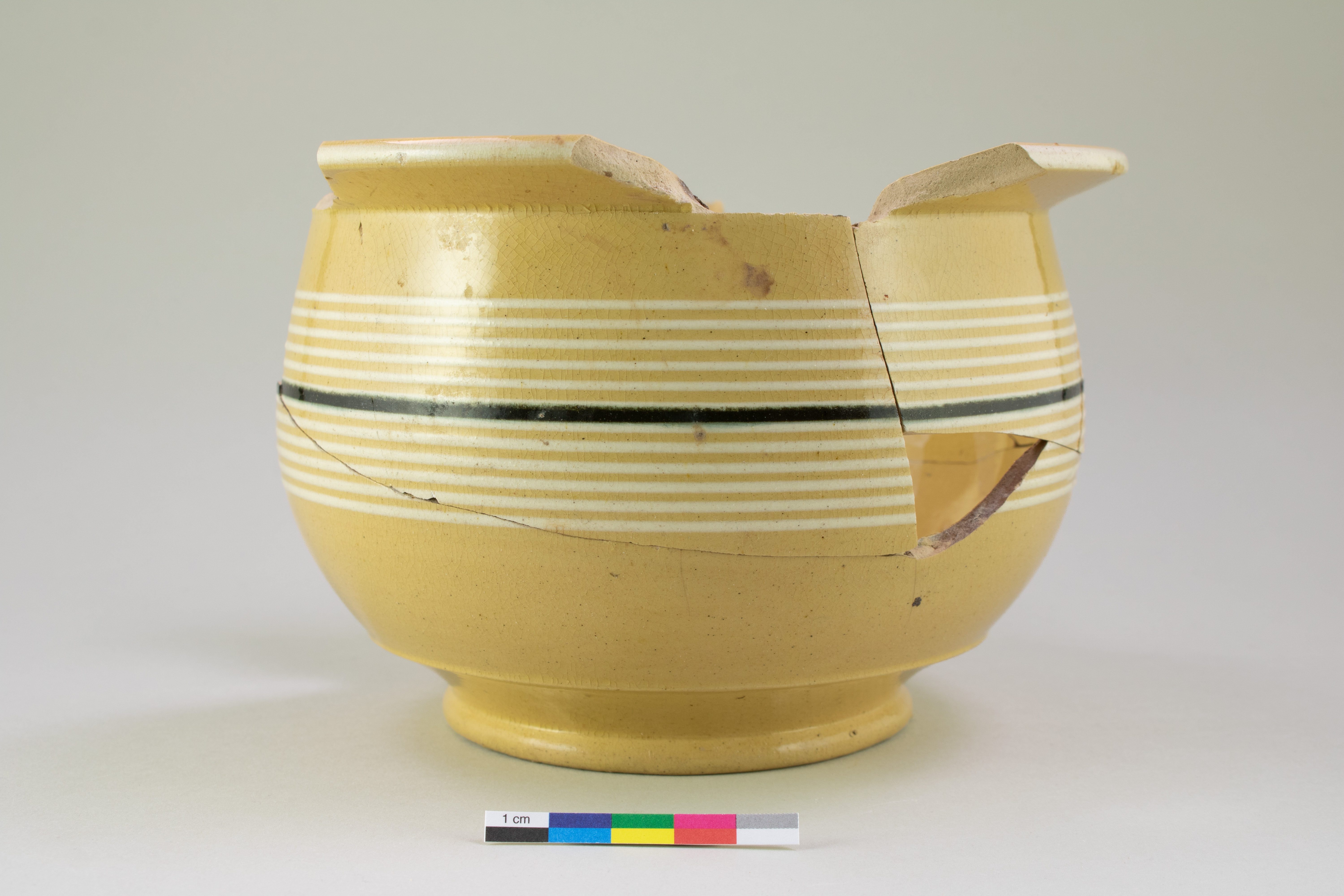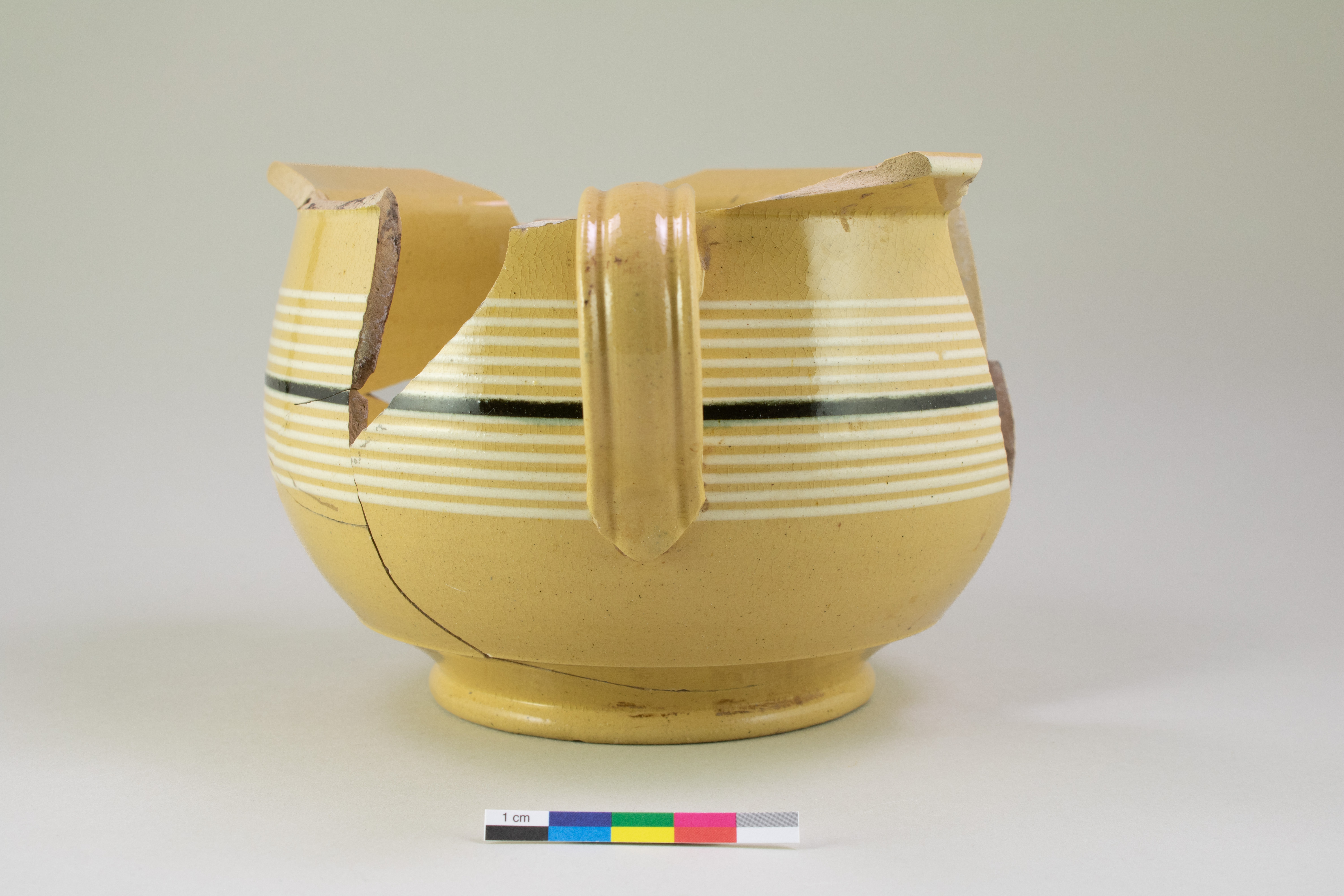 Le pot de chambre est un récipient lié à l'hygiène personnelle datant d'entre la fin du XVIIIe siècle et la fin du XIXe siècle. Complet, le pot en terre cuite fine jaune est composé de sept fragments. Il possède un corps globuleux, un pied annulaire, un large rebord et une anse latérale. Le pot est décoré de lignes annulaires blanches et brunes, réalisées à l'engobe. L'objet mesure 11 cm de hauteur et a un diamètre de 17 cm au niveau de l'ouverture incluant le rebord.
