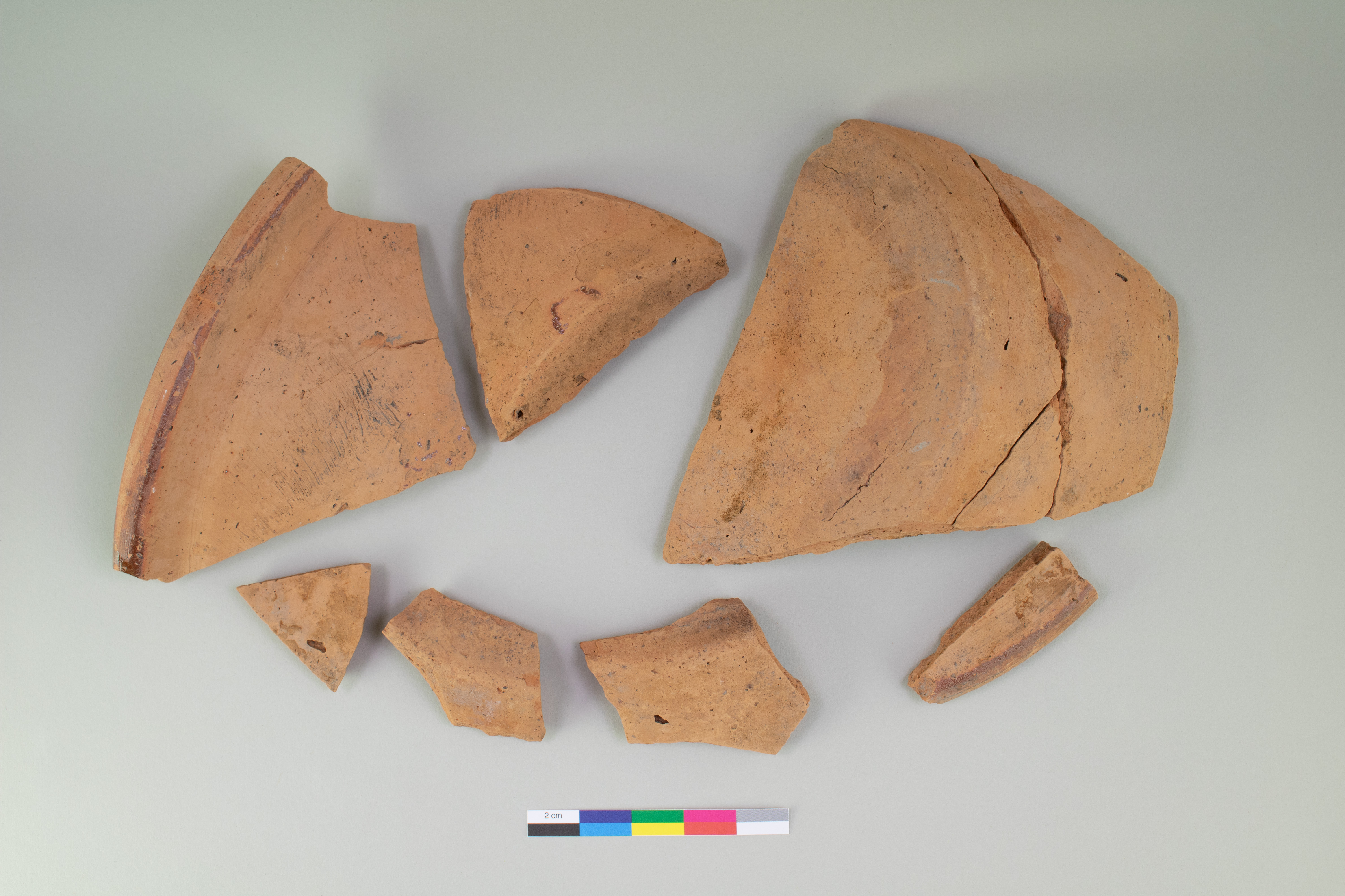 Le plat à aile ou jatte est un récipient lié à l'alimentation datant de la fin du XVIIIe siècle ou du début du XIXe siècle. Incomplet, le plat en terre cuite commune locale est composé de neuf fragments. Sa surface intérieure est ornée d'un décor de lignes horizontales ondulées réalisé à l'engobe blanc. Une glaçure incolore recouvre la surface intérieure ainsi que le rebord du plat. L'objet a un diamètre de 18 cm au niveau de la base et de 33 cm au niveau de l'ouverture.