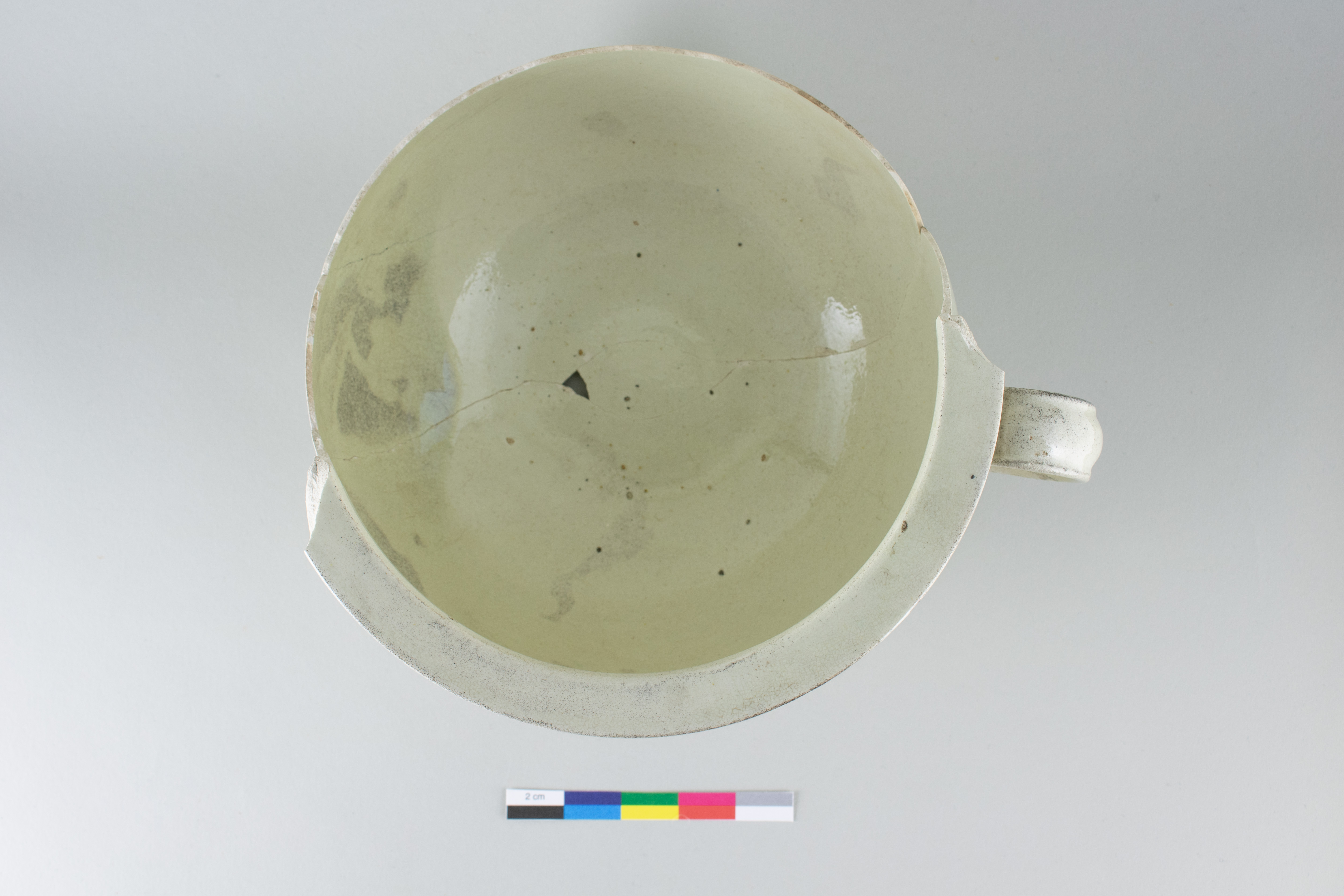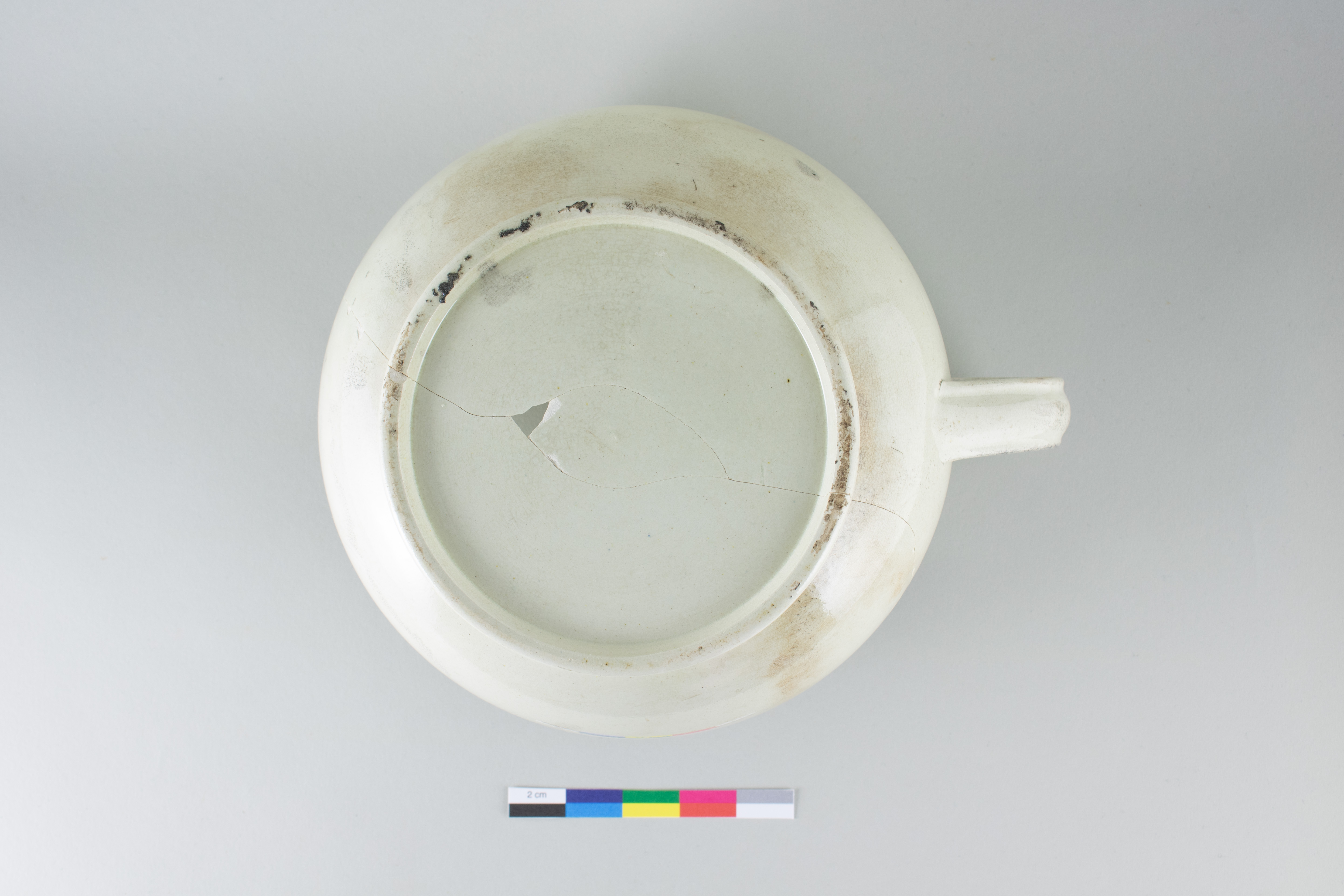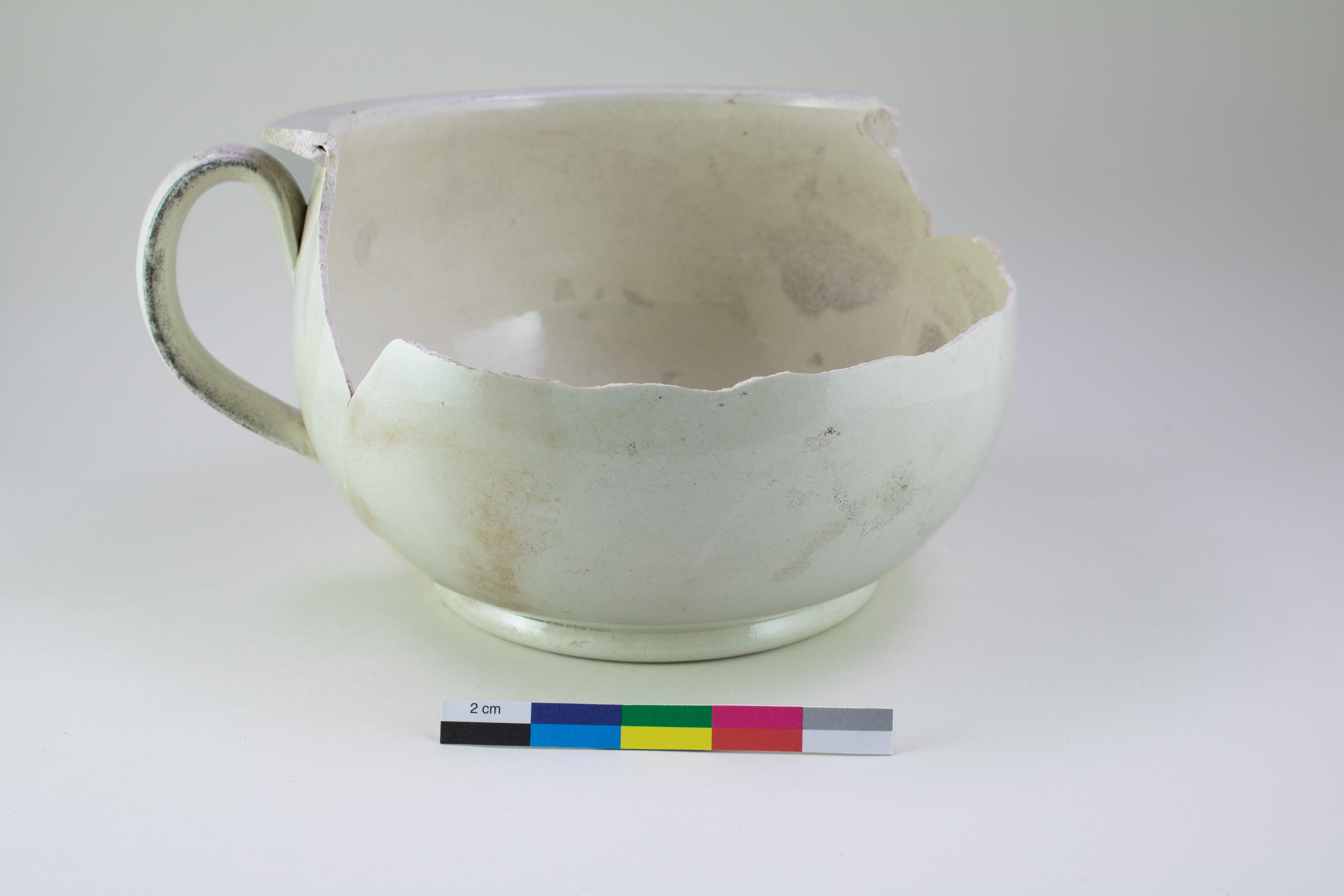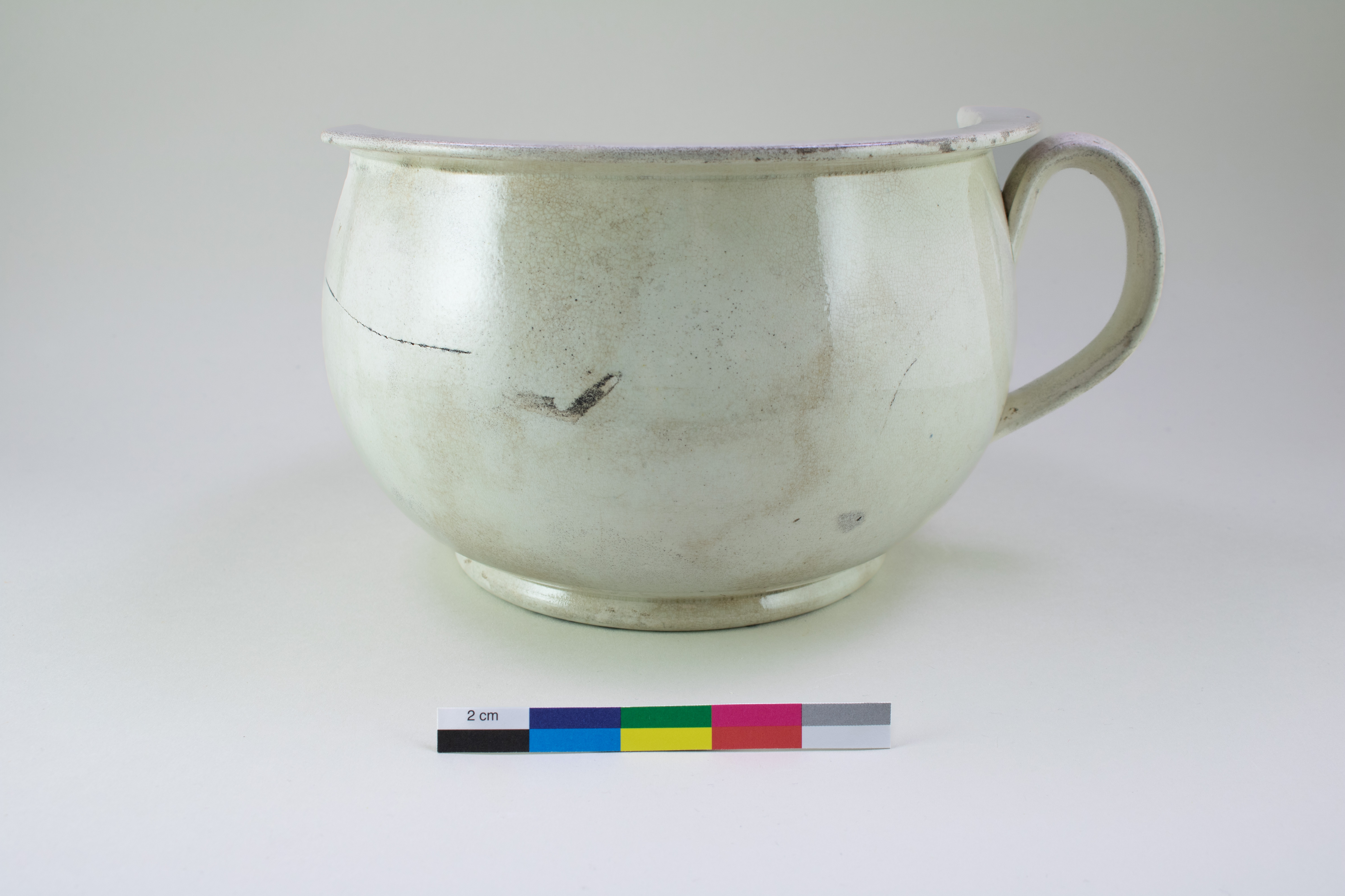 Le pot de chambre est un récipient lié à l'hygiène personnelle datant d'entre la moitié du XVIIIe siècle et le premier quart du XIXe siècle. Incomplet, le pot en terre cuite fine de type « creamware » est composé de trois fragments. Il présente un pied annulaire arrondi, un corps globulaire, un rebord étalé et plat ainsi qu'une anse latérale arrondie. L'objet mesure 13 cm de hauteur et a un diamètre de 13 cm au niveau de la base.