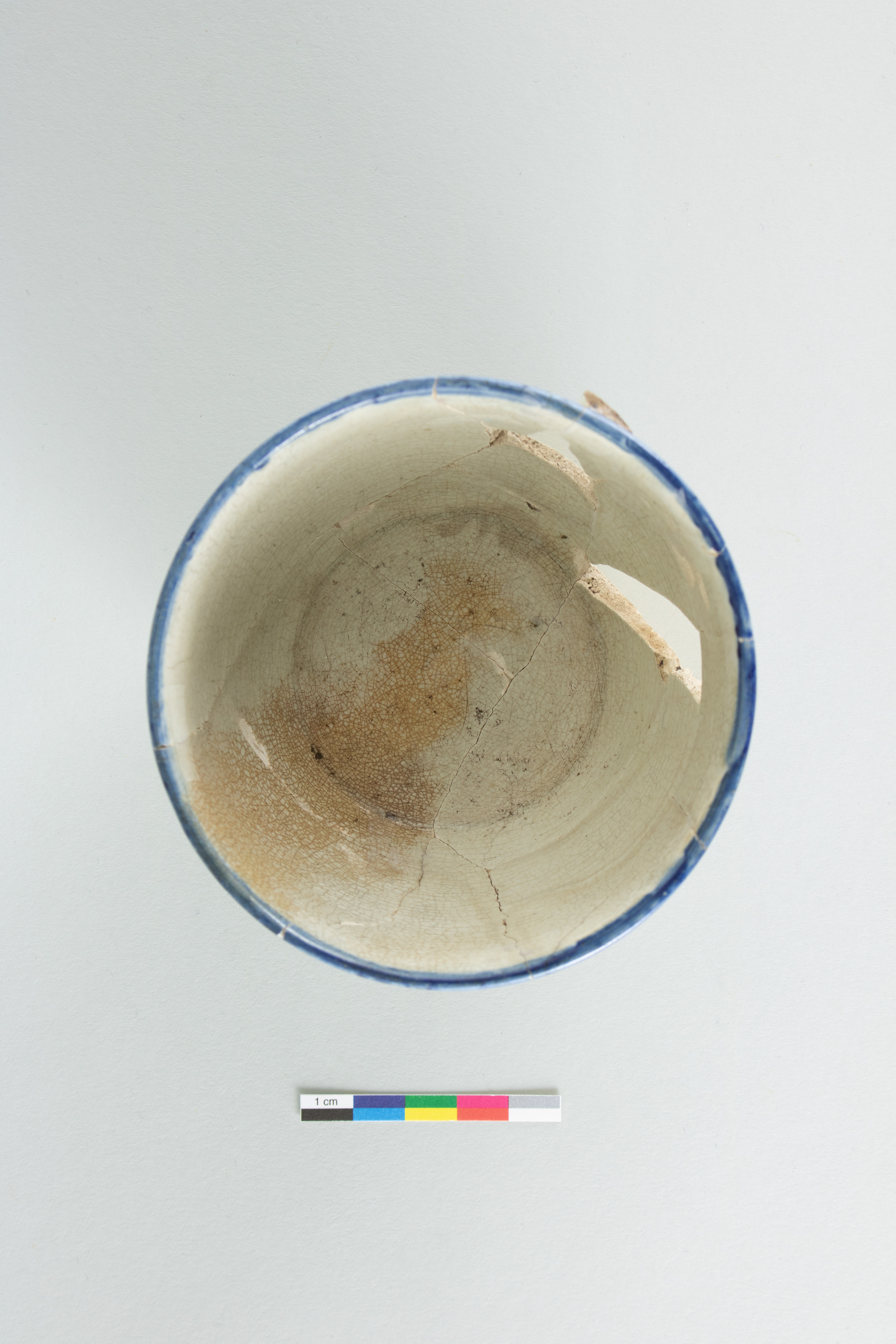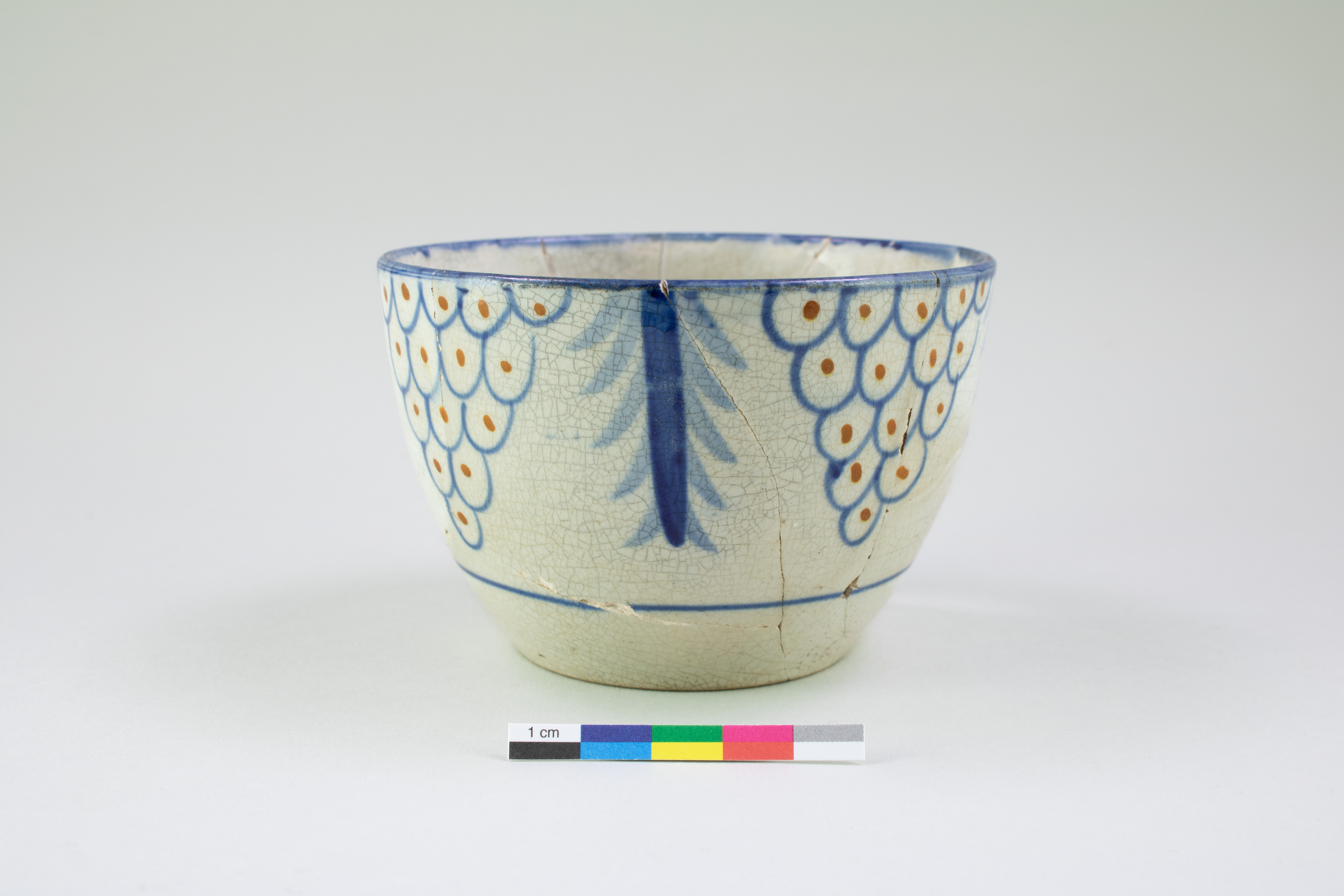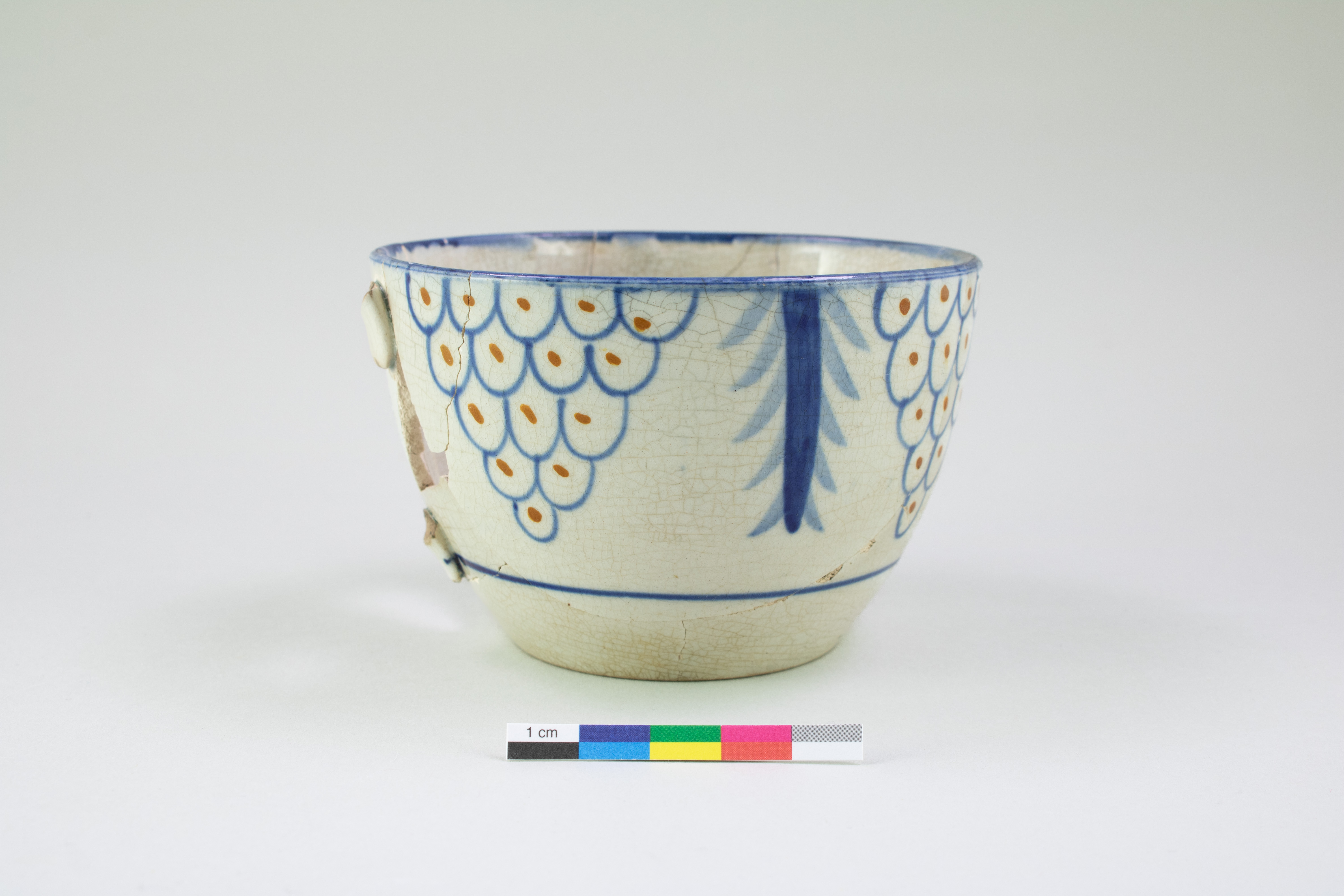 La tasse est un récipient lié à l'alimentation datant du premier tiers du XIXe siècle. Incomplète et fragmentée, la tasse est fabriquée en terre cuite fine de type « pearlware ». Elle présente un corps globulaire et son anse latérale est manquante. La tasse est ornée d'un décor géométrique et végétal bleu et orange de style « polychrome » tardif. L'objet a une hauteur de 6,5 cm et une base ayant un diamètre de 5,5 cm.