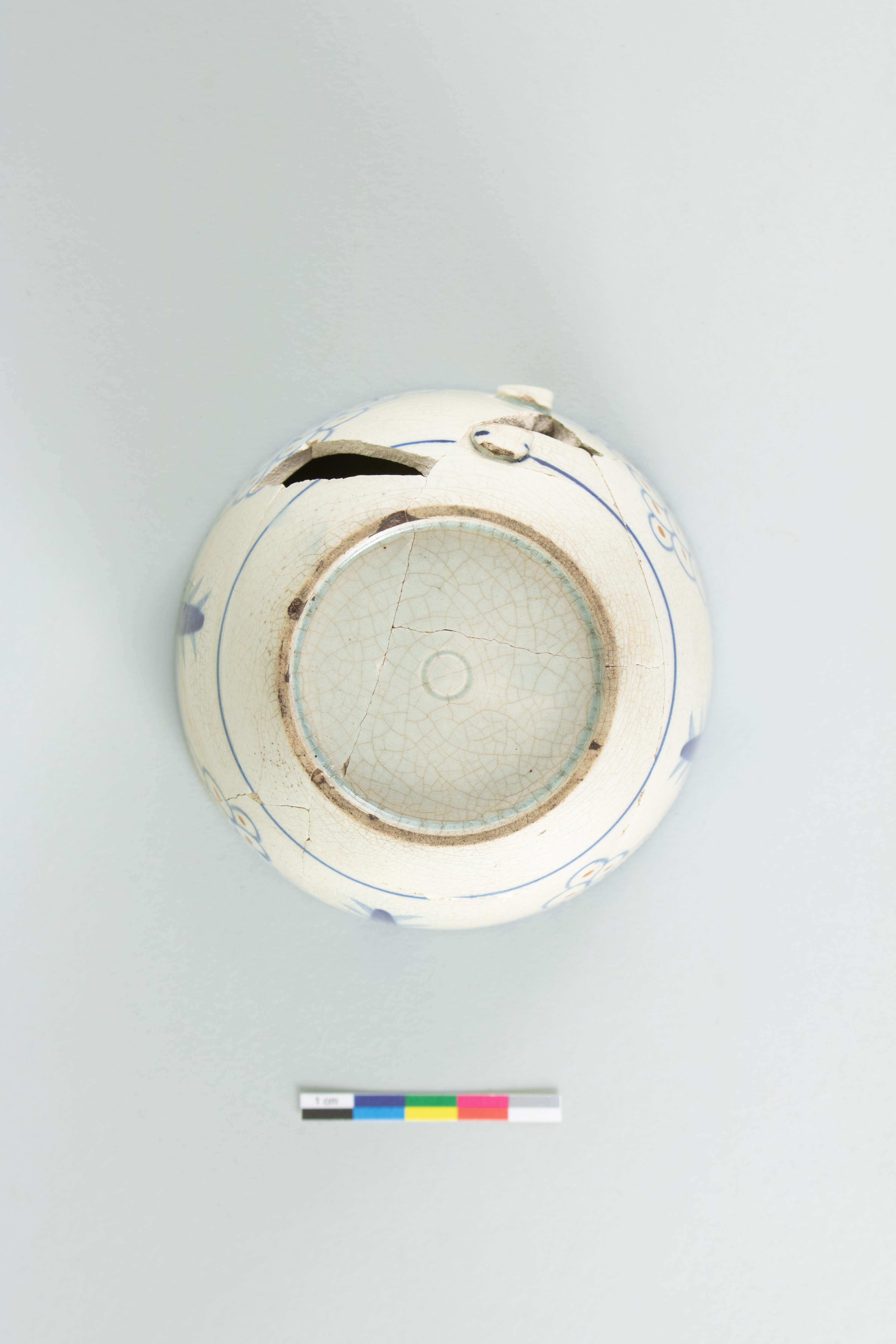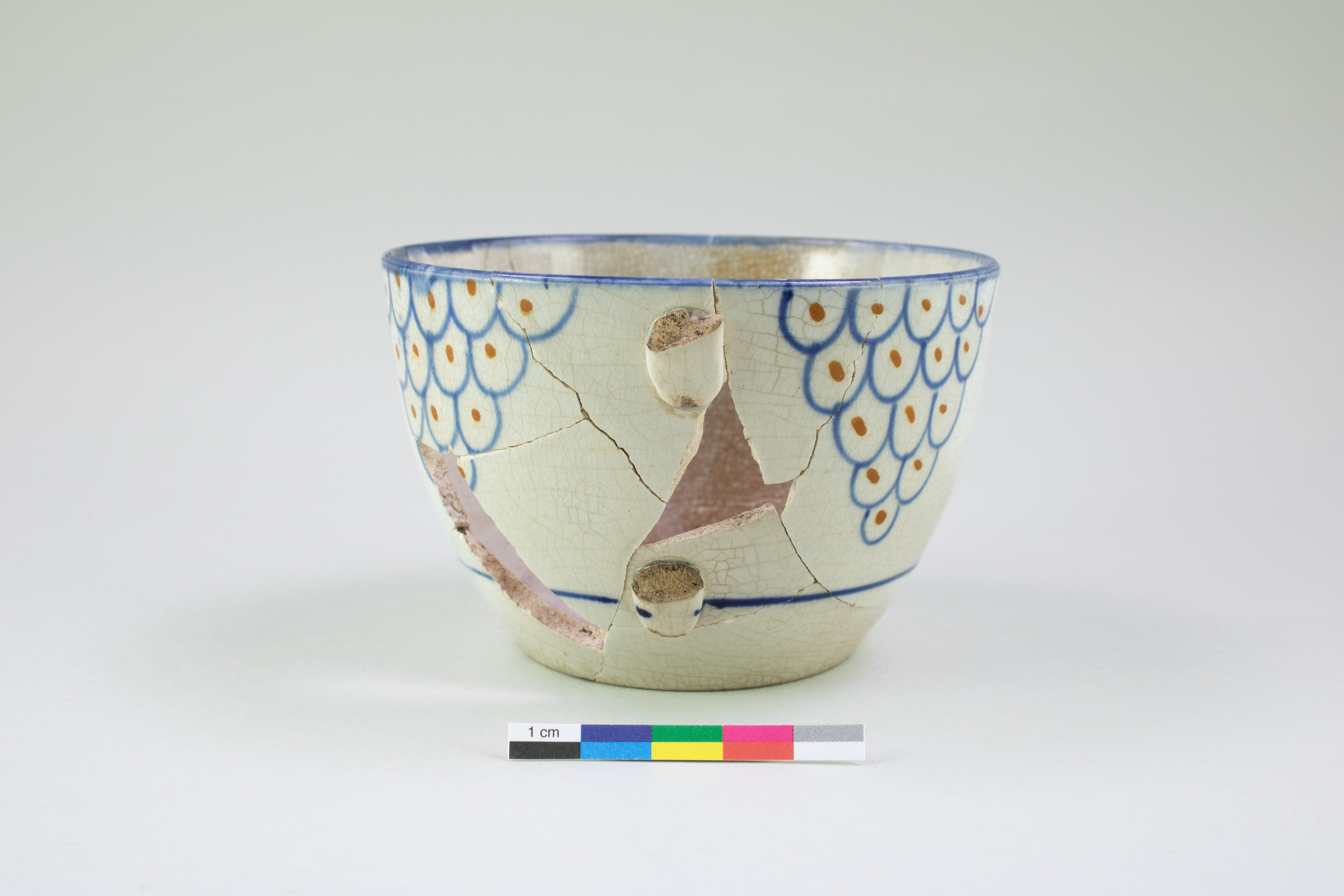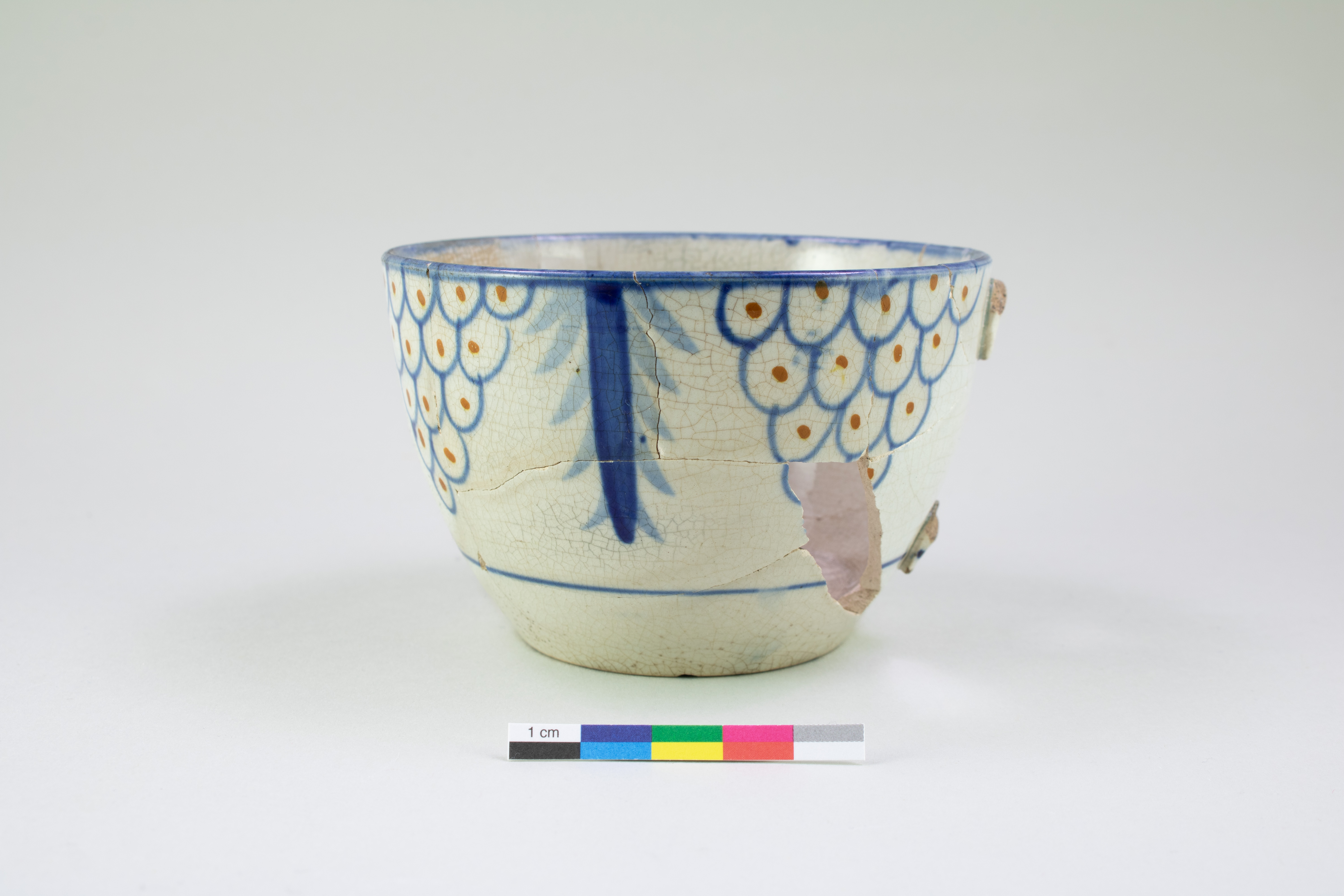 La tasse est un récipient lié à l'alimentation datant du premier tiers du XIXe siècle. Incomplète et fragmentée, la tasse est fabriquée en terre cuite fine de type « pearlware ». Elle présente un corps globulaire et son anse latérale est manquante. La tasse est ornée d'un décor géométrique et végétal bleu et orange de style « polychrome » tardif. L'objet a une hauteur de 6,5 cm et une base ayant un diamètre de 5,5 cm.