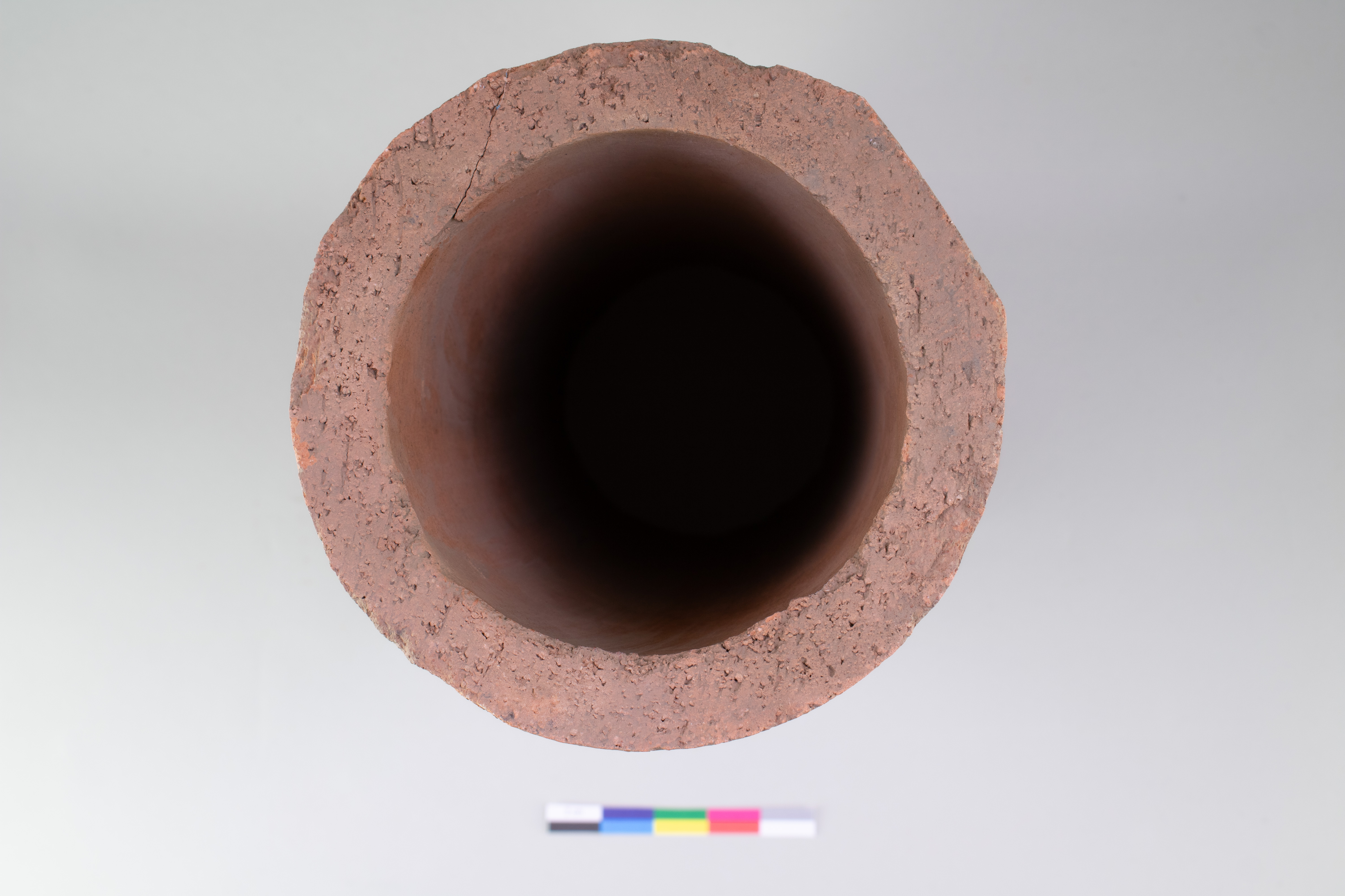 Le conduit en terre cuite commune non glaçuré est moulé au XXe siècle, possiblement en Amérique du Nord. Il est de forme cylindrique avec un pan plat, possiblement pour le stabiliser sur une surface plane. Le conduit sert au transport de la chaleur au sein d'un bâtiment, industriel dans ce cas-ci. L'intérieur du conduit présente d'ailleurs de légères traces noirâtres, qui témoignent de son utilisation comme conduit de chauffage.