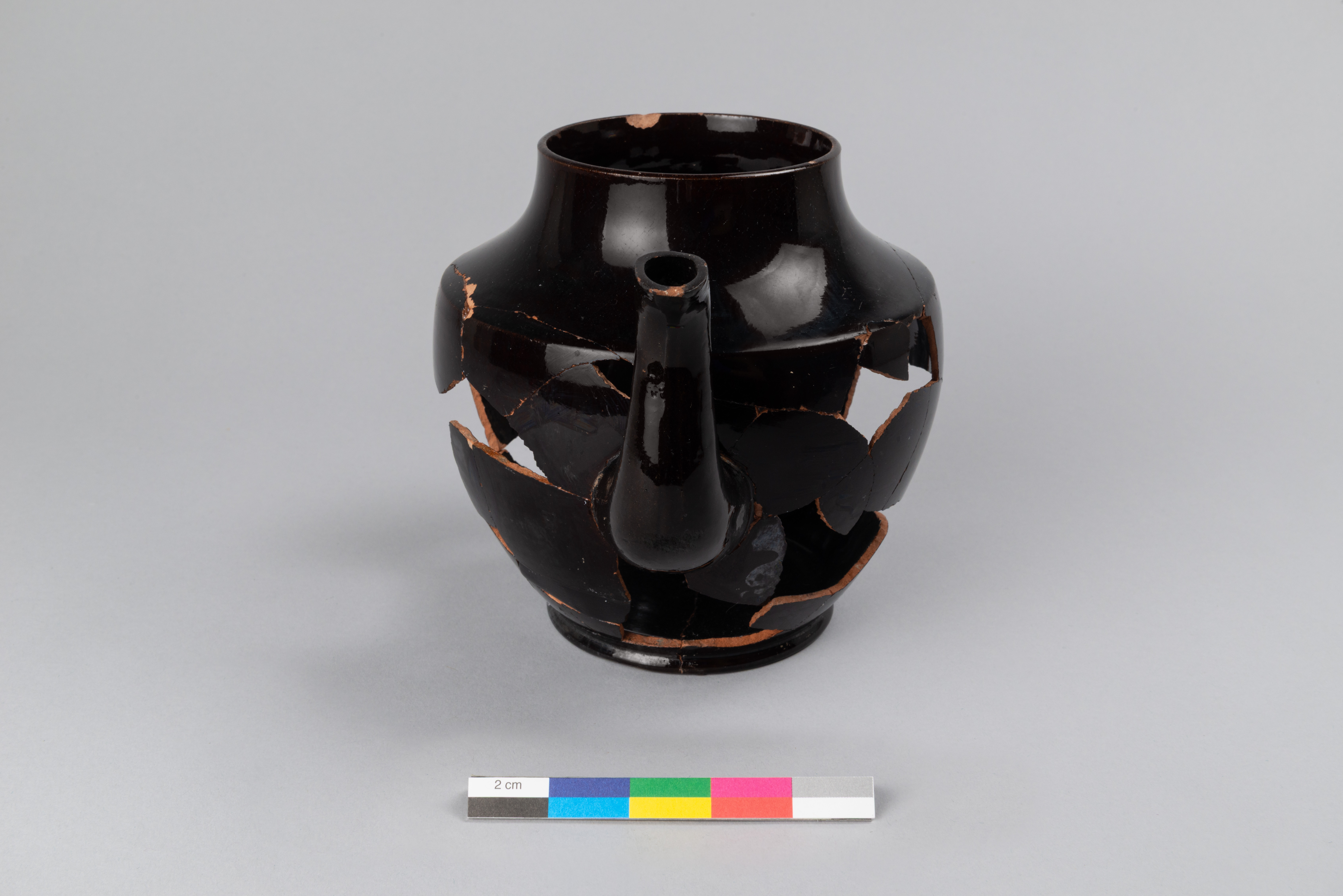 La cafetière est un récipient utilisé pour la préparation et le service de café, de chocolat chaud ou d'autres boissons chaudes. À la fin du XVIIIe siècle et au cours de la première moitié du XIXe siècle, la théière se distingue normalement par sa forme plus globulaire que la cafetière, qui a tendance à être plus allongée comme ici. D'après le contexte de sa découverte en milieu commercial, cette cafetière peut avoir servi à plusieurs utilisateurs, comme des commerçants, des employés ou des visiteurs de passage. Elle peut également avoir été jetée dans les caves en tant qu'objet invendu. Son faible coût d'achat en fait une céramique idéale pour une cantine ou d'autres lieux de restauration établis au marché.