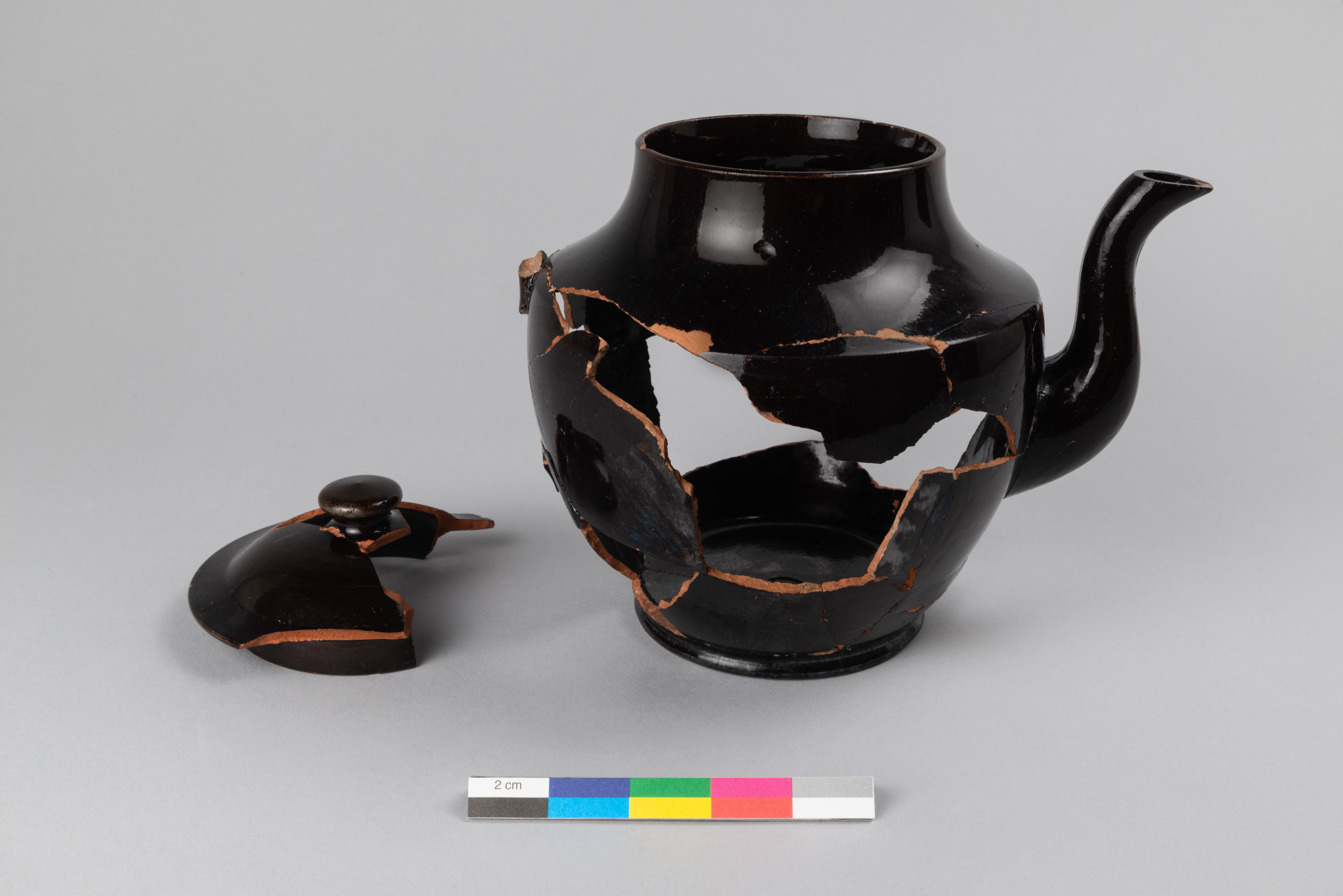 La cafetière est un contenant lié à l'alimentation datant du deuxième quart du XIXe siècle. Incomplète, la cafetière en terre cuite fine rouge à glaçure noire est constituée d'un corps circulaire allongé et d'un couvercle. L'épaule est concave, le col cylindrique est haut et le récipient repose sur un petit piédouche. L'anse verticale est absente. Le couvercle consiste en un dôme arrondi bas avec une collerette annulaire et aile plate. Il est doté d'un bouton central en forme de disque arrondi. L'objet a une longueur préservée de 19,5 cm, une largeur de 14,8 cm et une hauteur de 15 cm.