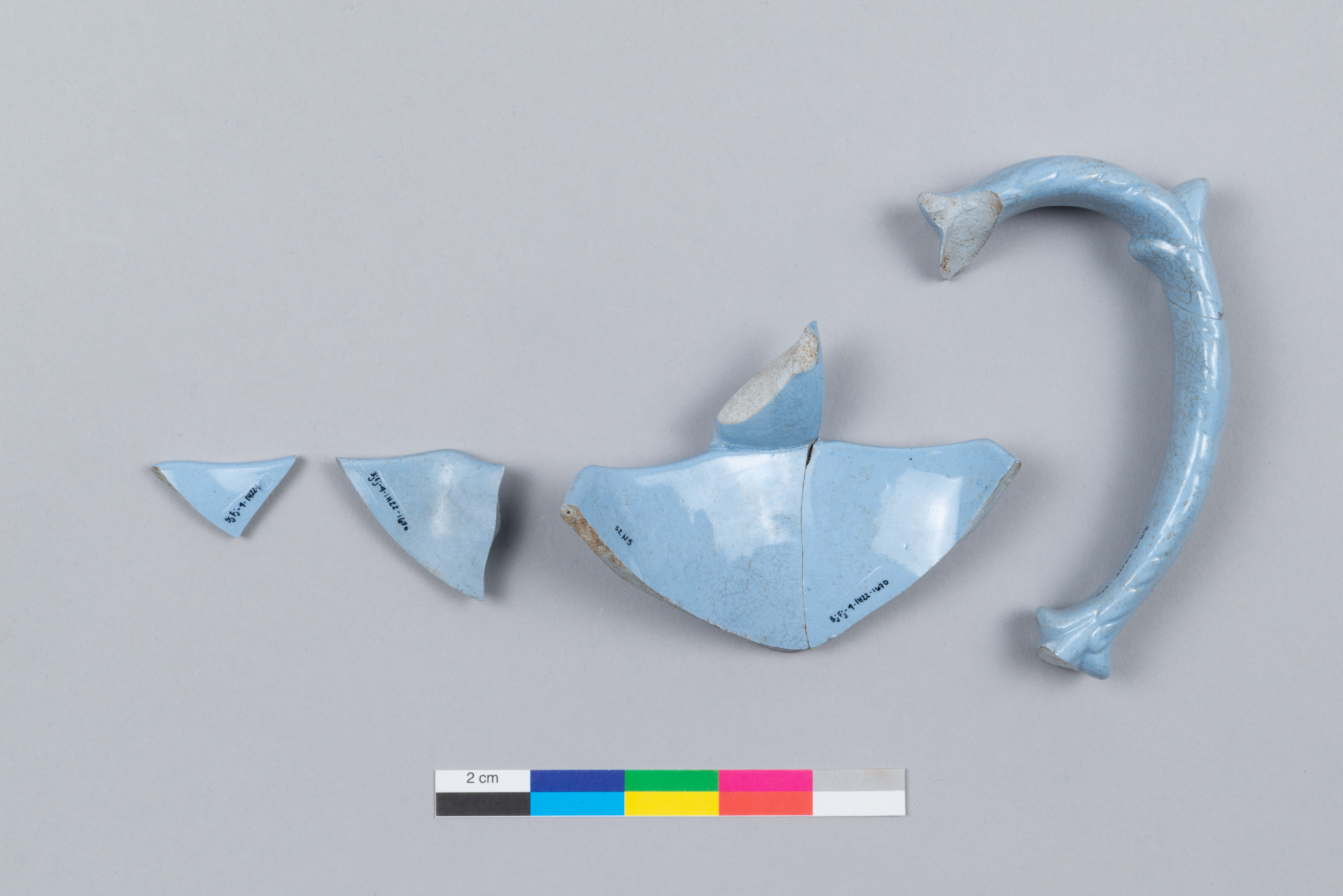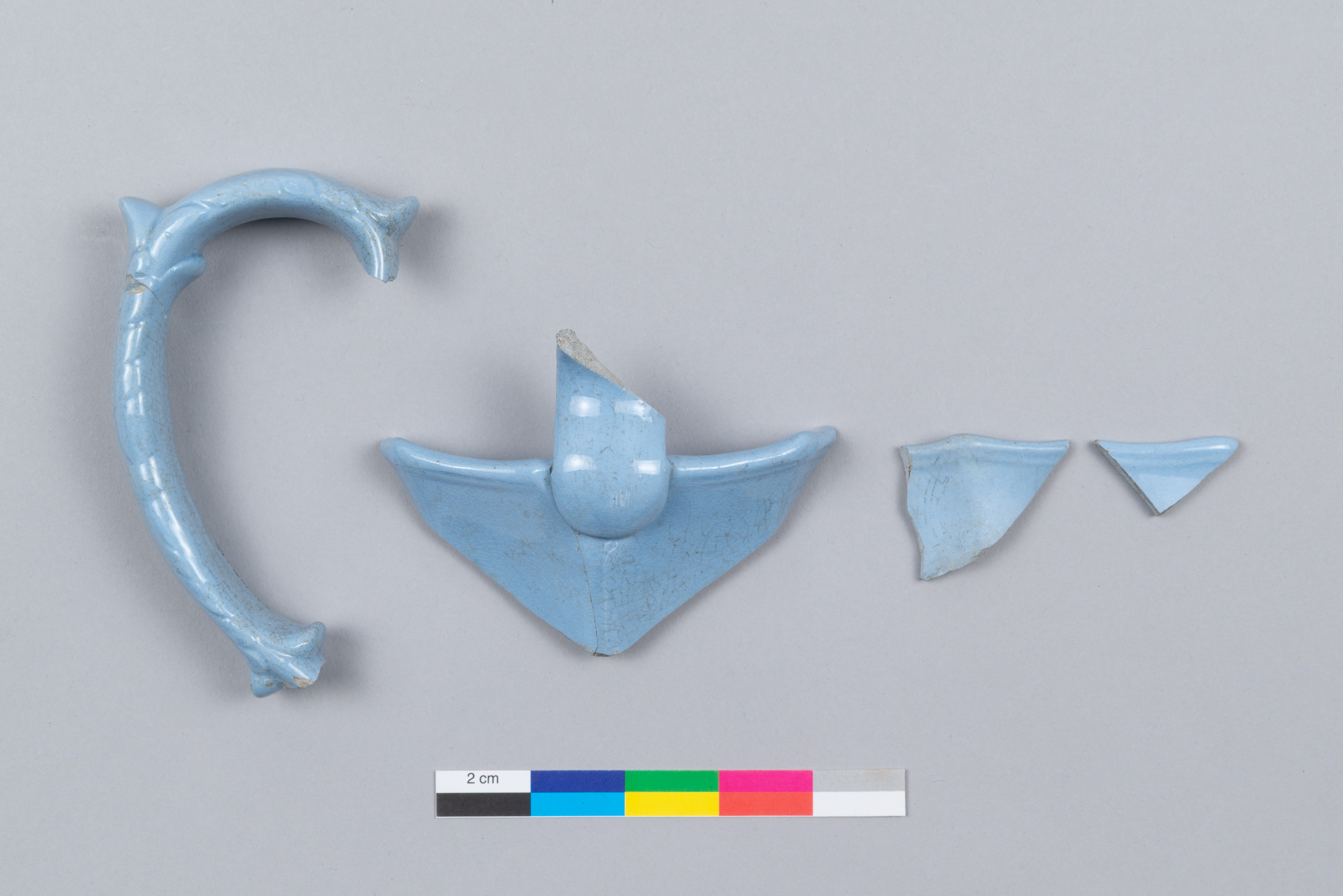 Le pichet est un objet lié à l'alimentation utilisé pour transvaser et servir des liquides datant du deuxième quart du XIXe siècle. Constitué de six fragments, ce pichet est fait de terre cuite fine colorée dans la masse en bleu. Seulement une partie du col du pichet et de l'anse verticale sont préservés. Le col est à pans plats, et l'anse comporte un décor moulé en relief à motif de volutes. Celle-ci est plus haute que le rebord. L'objet a des dimensions préservées de 8,5 cm de longueur, de 6 cm de largeur et de 10,8 cm de hauteur.
