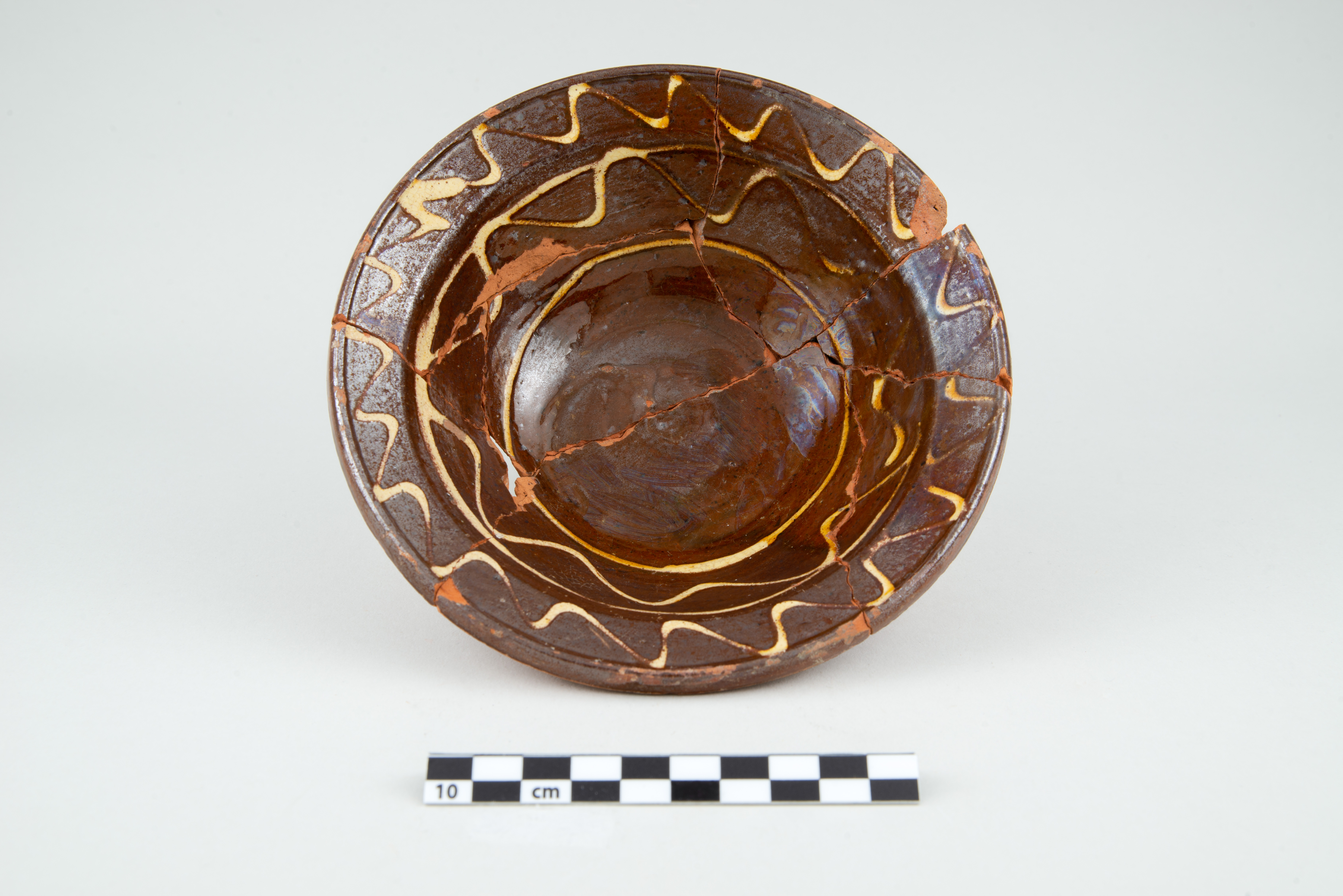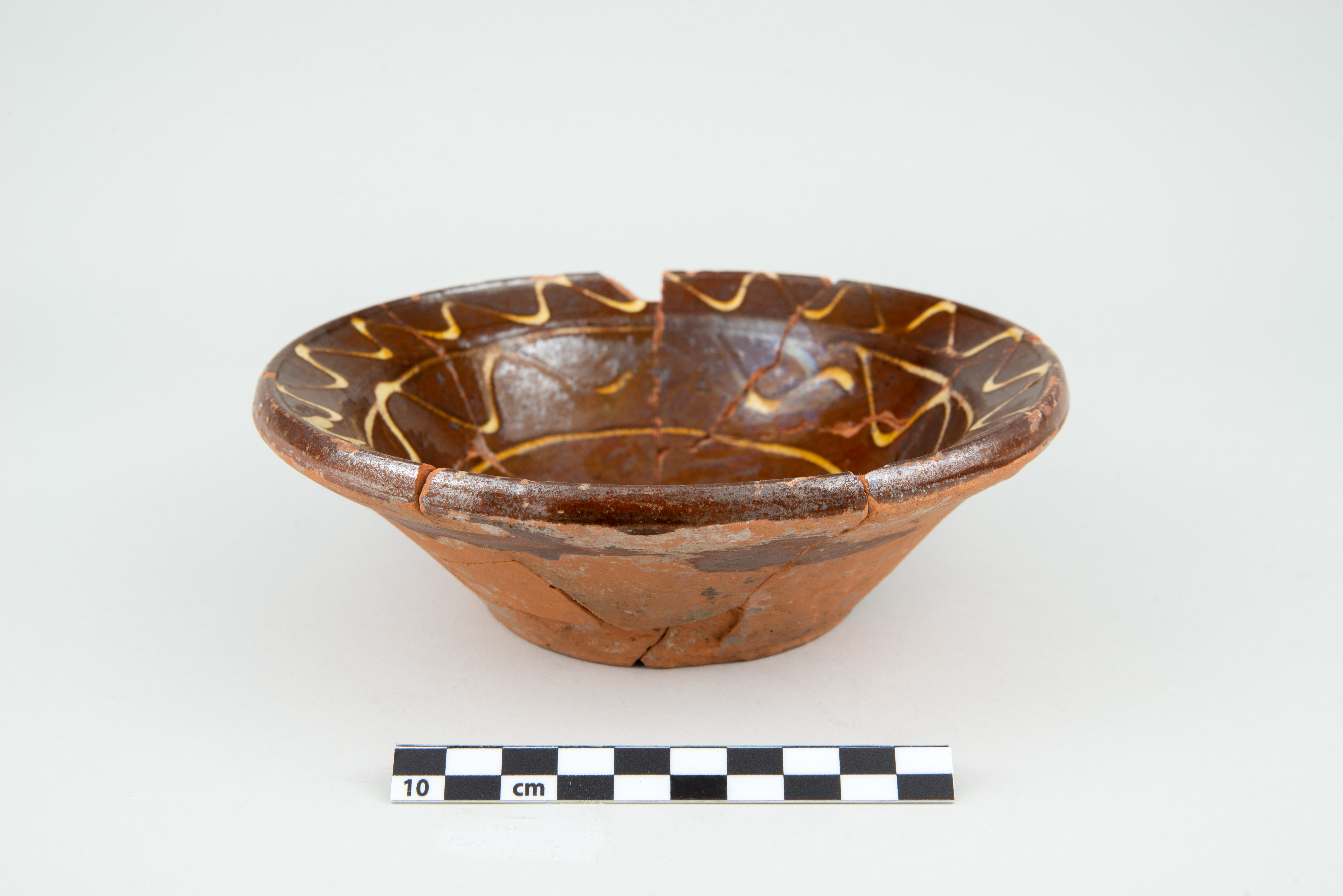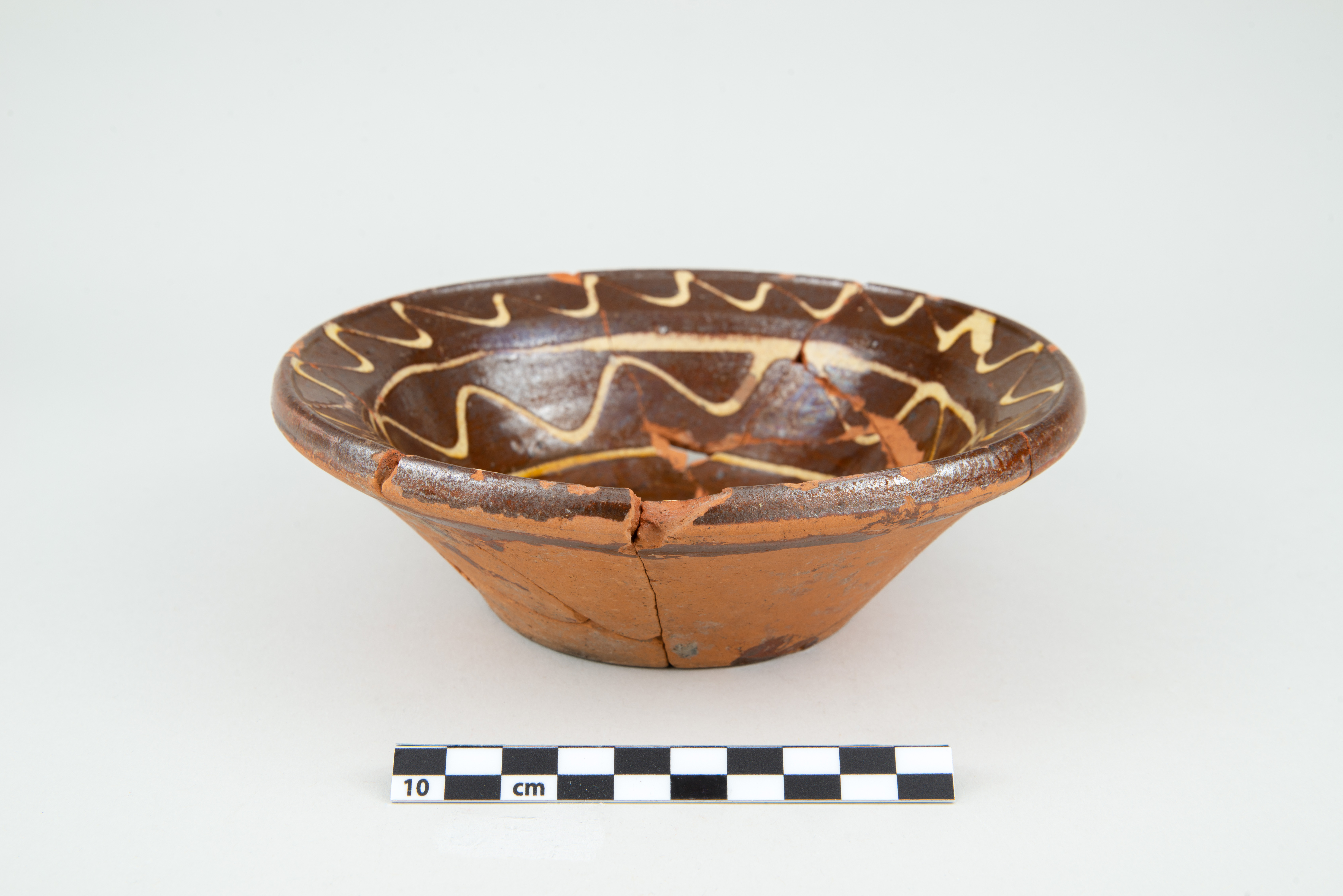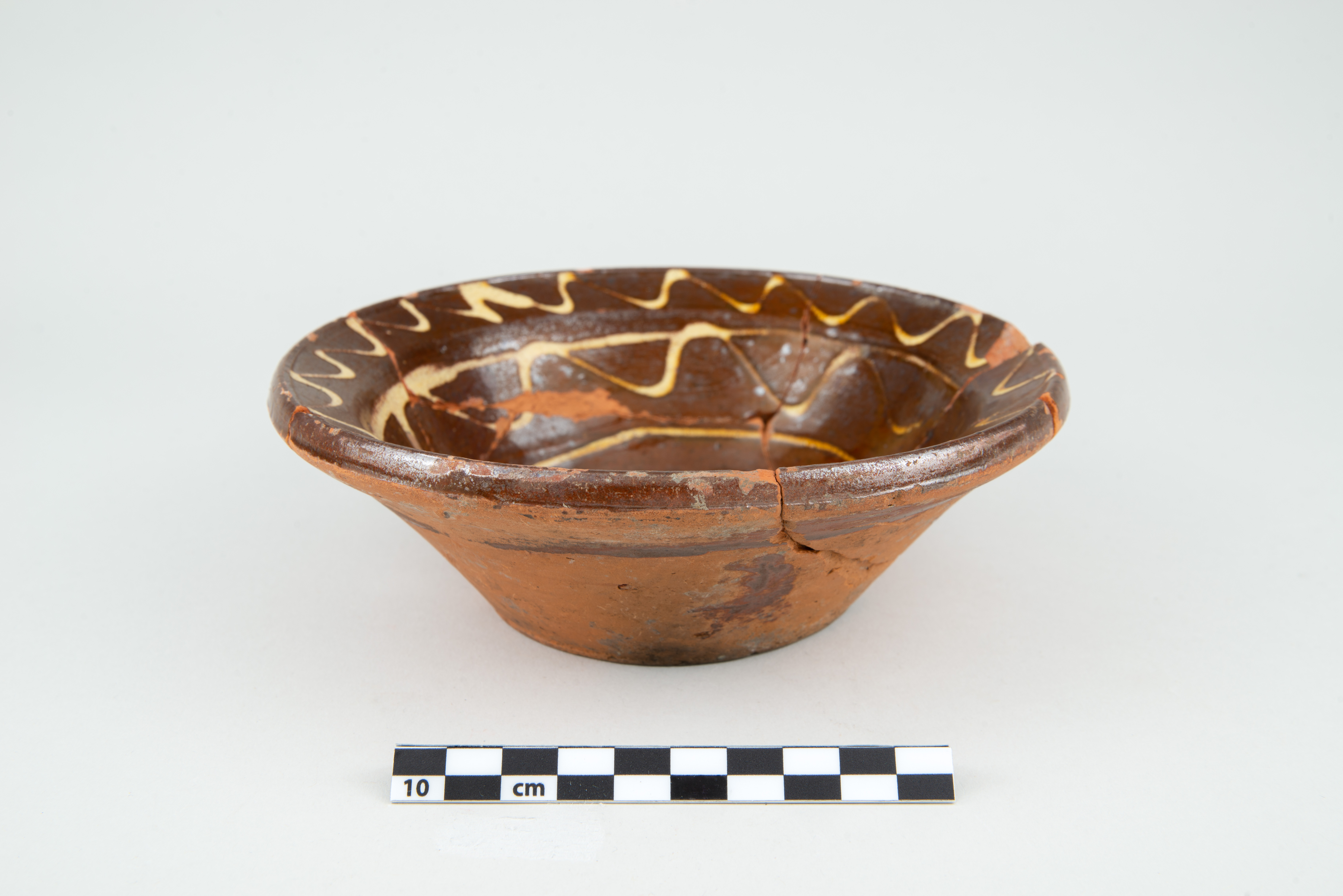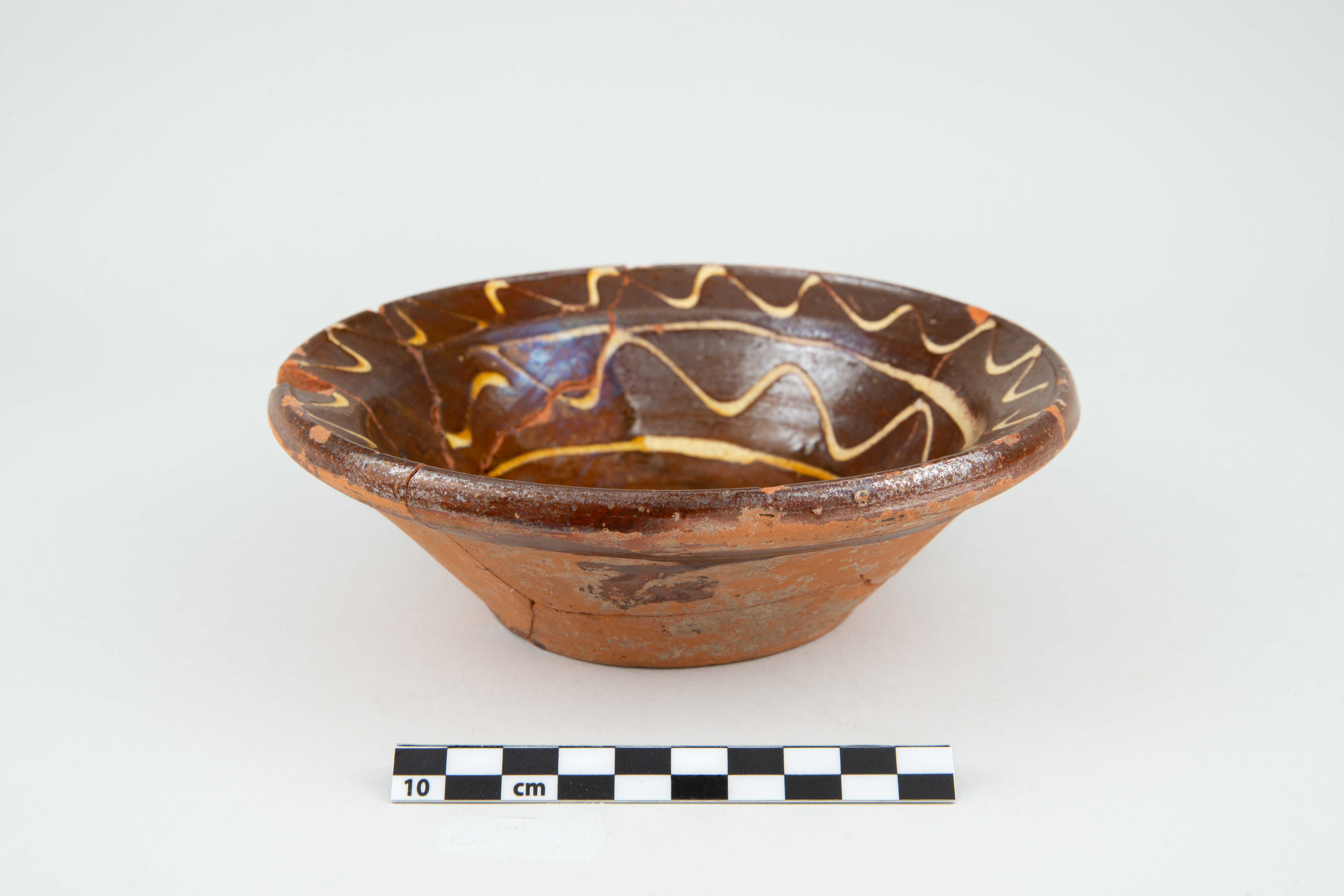Le plat est un récipient lié à l'alimentation datant de la première moitié du XIXe siècle. De petite taille, le récipient circulaire en terre cuite commune locale comporte une aile oblique à lèvre en saillie, une panse tronconique et un fond plat. La surface intérieure du plat est ornée d'un motif à l'engobe composé de lignes horizontales et sinueuses. Le fond du plat comporte quelques traces de suie. L'objet complet mesure 17,5 cm de diamètre et 5,7 cm de hauteur.