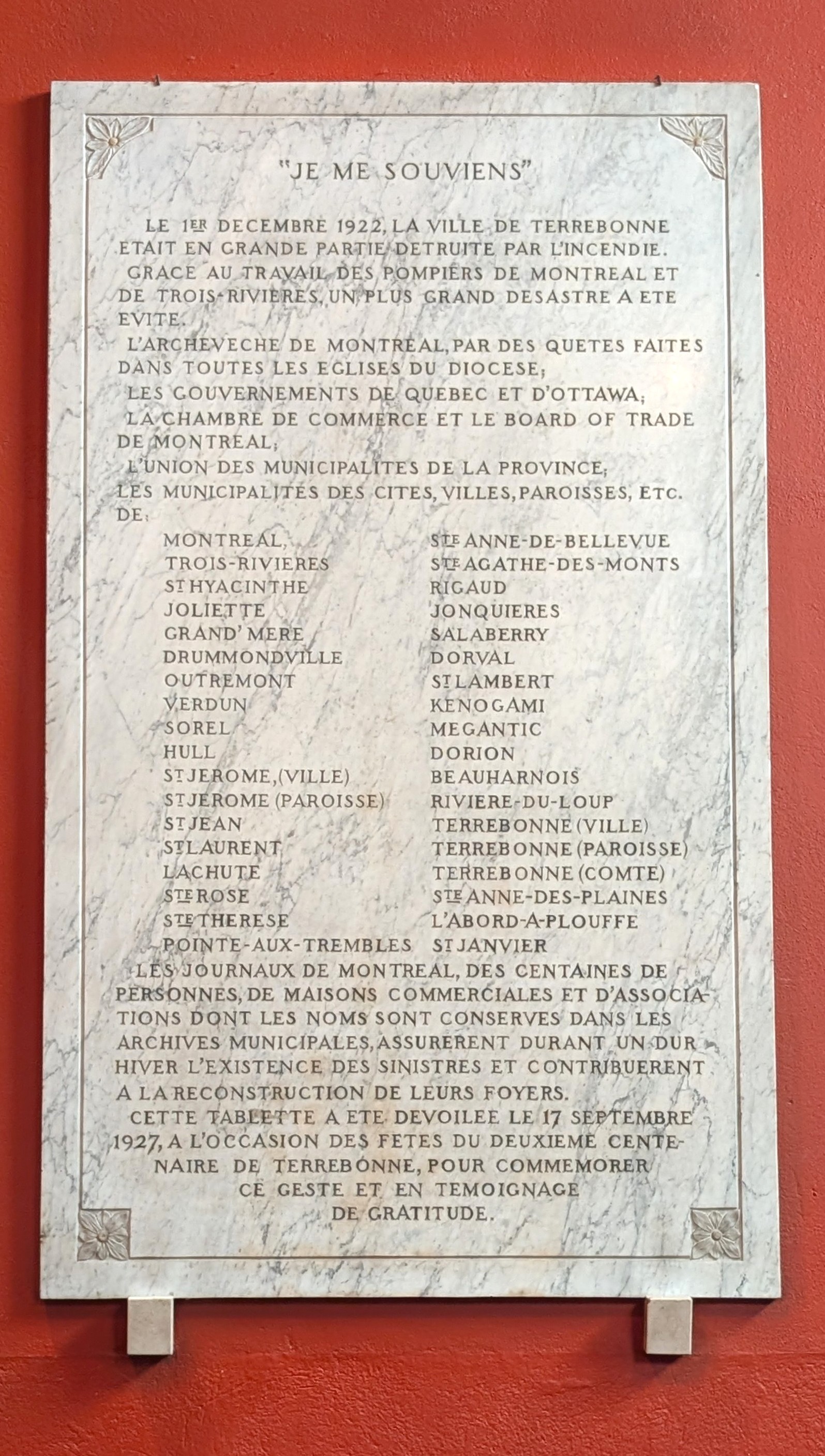 Plaque de l’incendie de Terrebonne du 1er décembre 1922