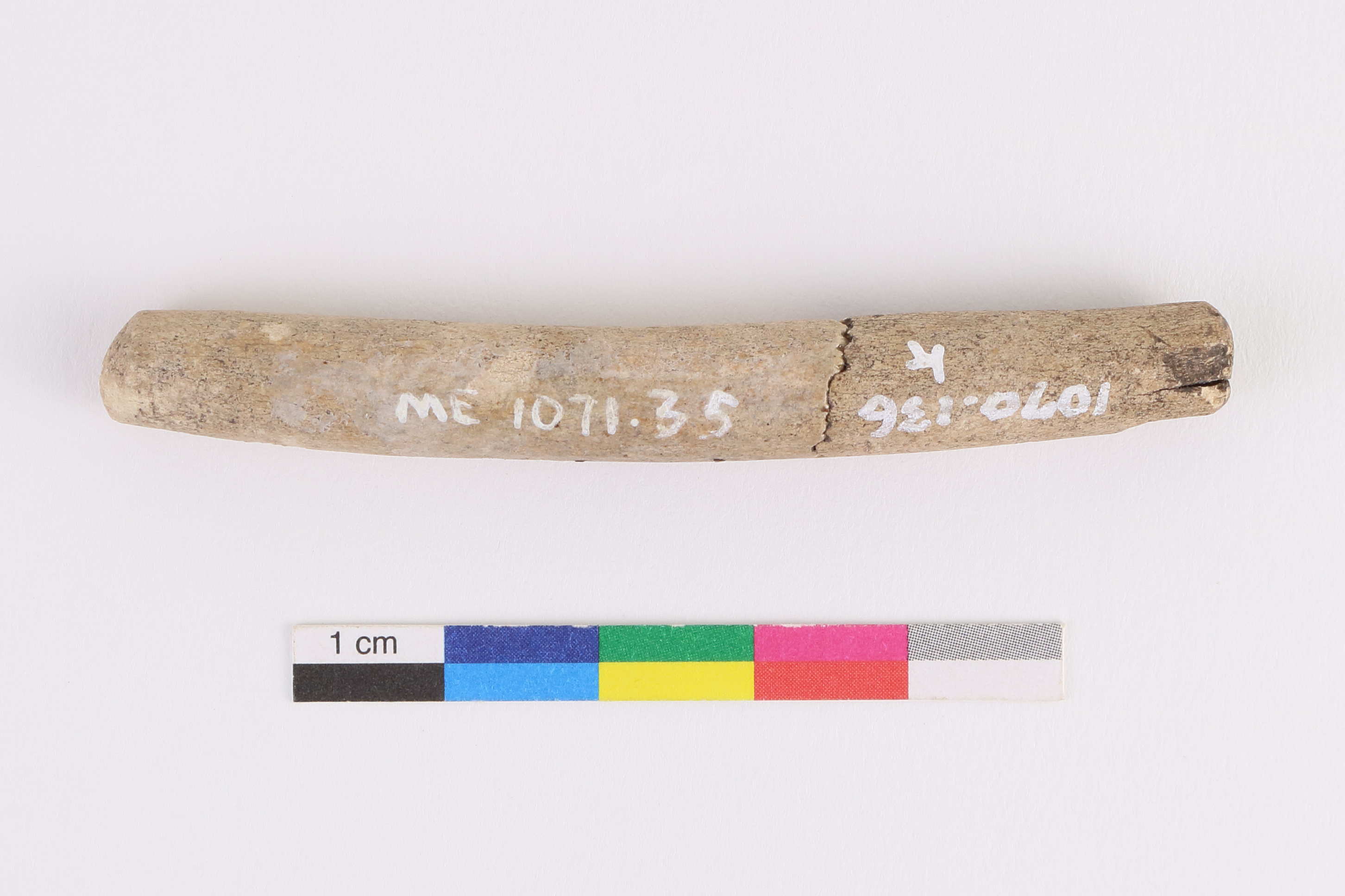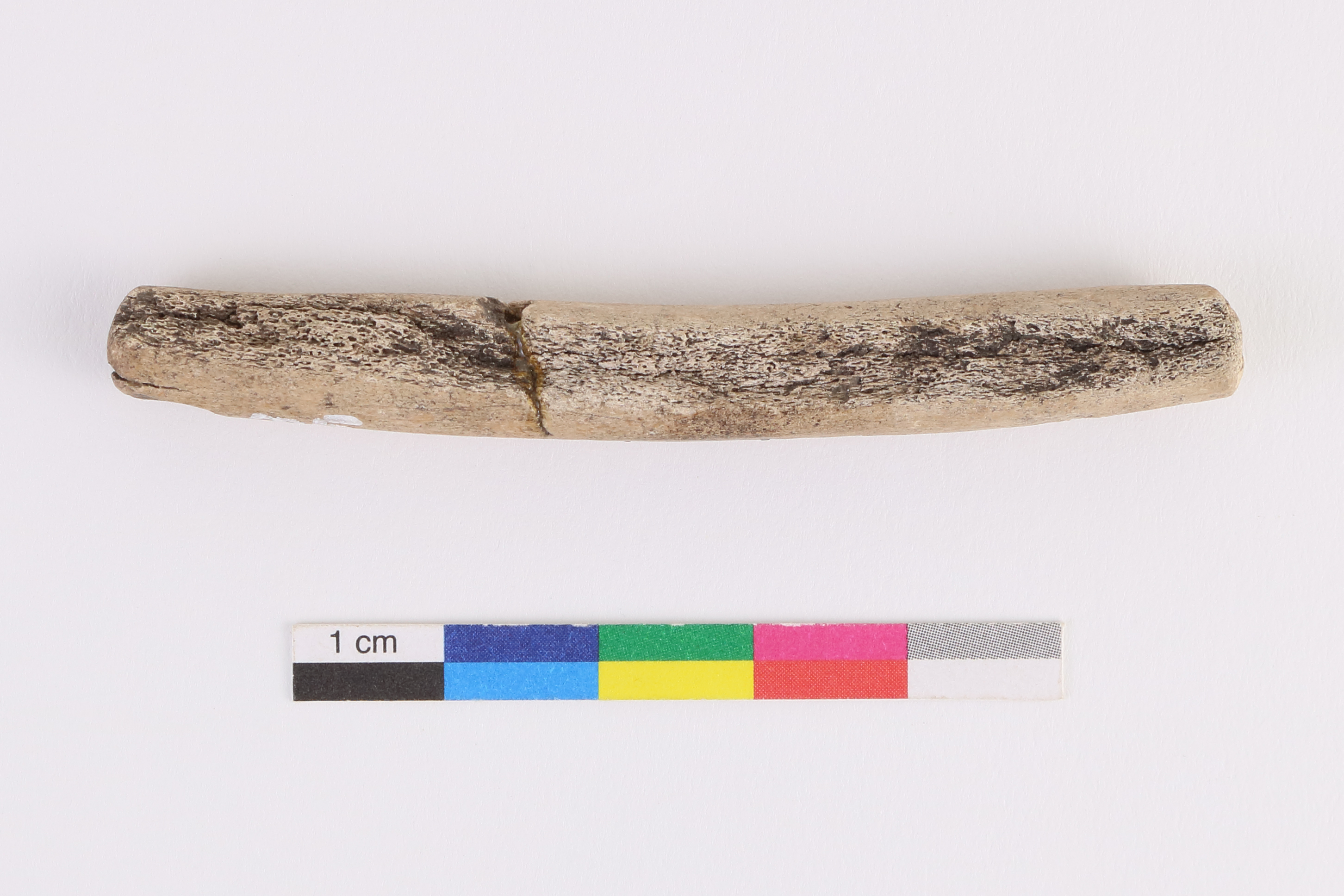 Un petit éclat d'os semble être retiré depuis une des extrémités de l'objet et une fissure traverse ce petit enlèvement.