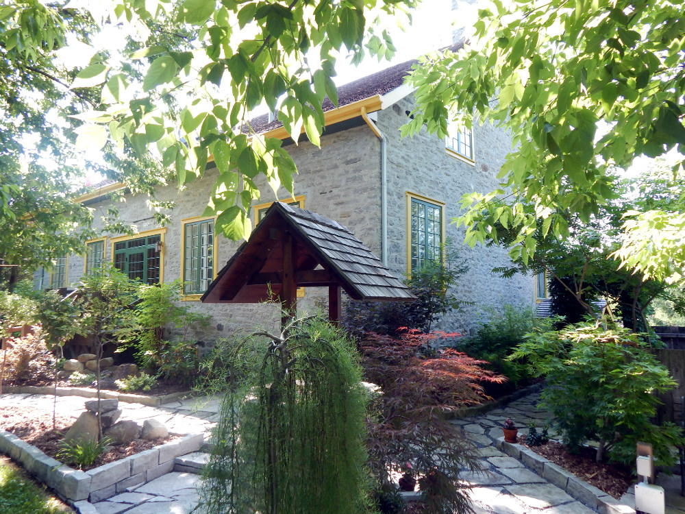 - ses éléments d'influence urbaine, dont la maçonnerie en pierre, le solage dégagé, la cave, la porte de cave et les soupiraux ainsi que les larges souches de cheminée à deux têtes dans le prolongement des murs pignons;