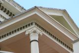 - les éléments d'ornementation, dont les planches cornières, les chambranles moulurés, la menuiserie décorative des lucarnes (corniches moulurées à modillons, à denticules et à consoles), les garde-corps en fonte ornementale, les colonnes à chapiteaux ioniques ainsi que les corniches moulurées à denticules et à consoles;