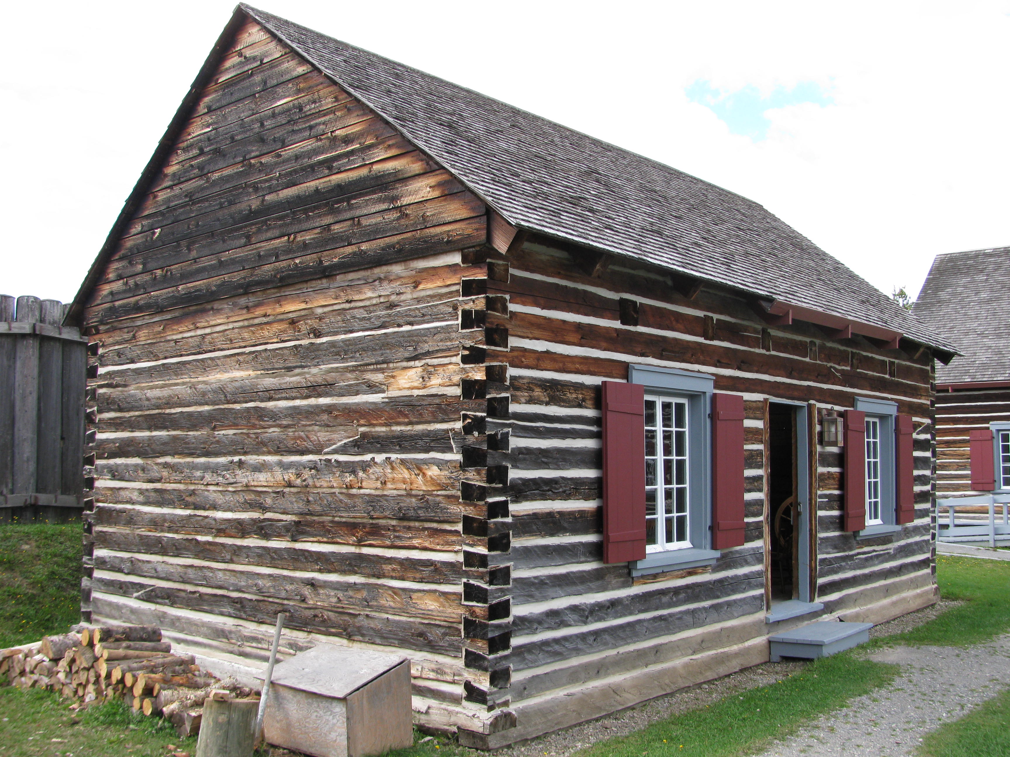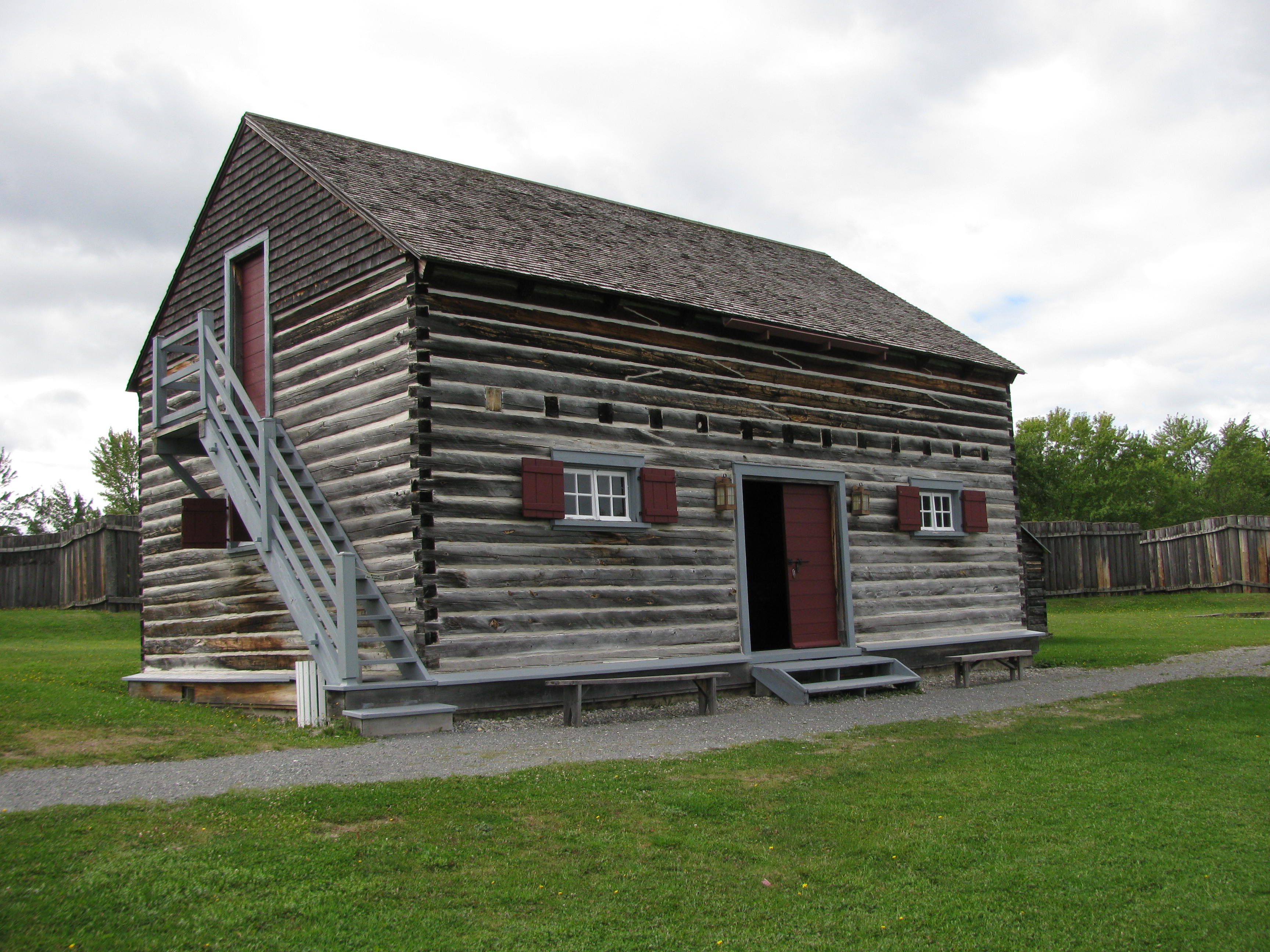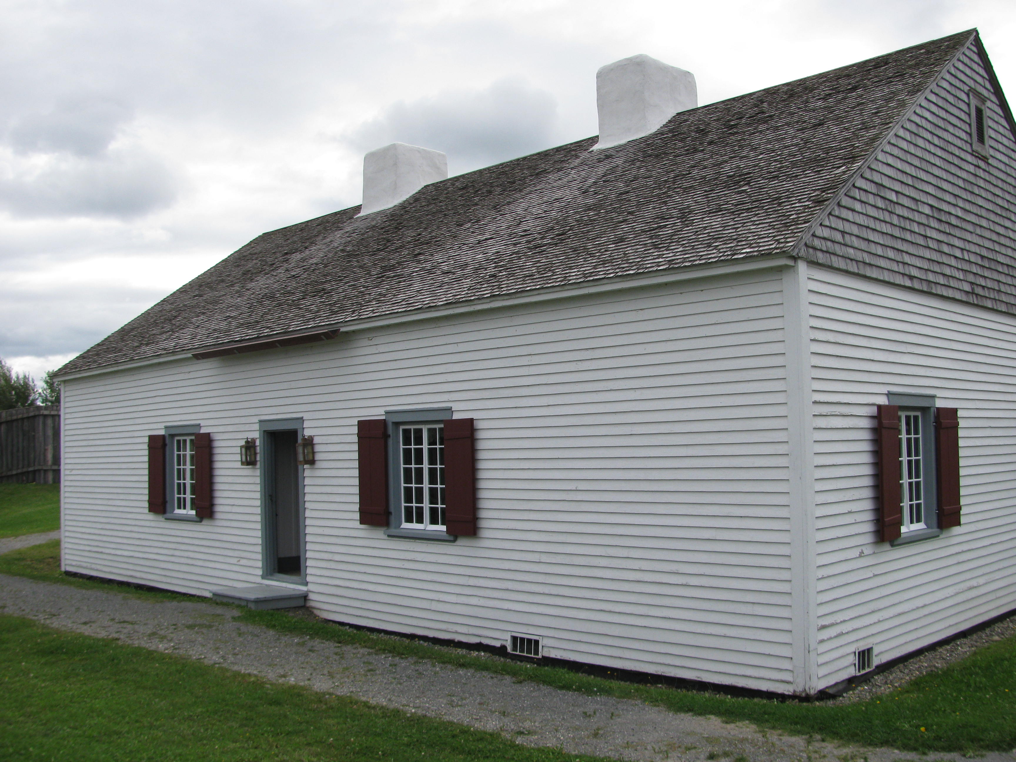 - les bâtiments reconstitués, dont l'intendance, les dortoirs nord et sud construits en pièce sur pièce (troncs d'épinette et de cèdre) selon la technique à coulisse, avec les angles des murs mortaisés en queue d'aronde, le dortoir des officiers aux murs recouverts de planches à clins blanchies à la chaux, le corps de garde, dont le second étage en saillie, la cuisine, la poudrière ainsi que deux bâtiments des latrines;