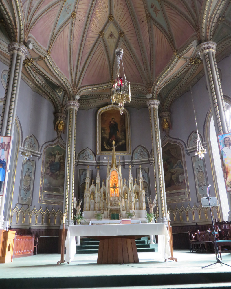 - le maître-autel et les autels latéraux d'inspiration néogothique ornés de statues ainsi que la chaire accessible par la galerie;