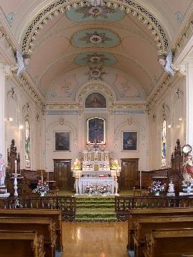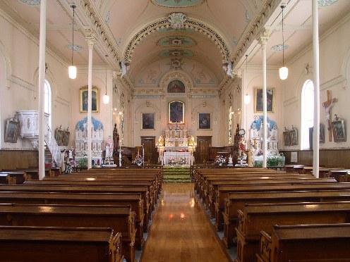 - le plafond du choeur et de la nef constitué d'une fausse voûte en arc ainsi que le plafond plat des bas-côtés;