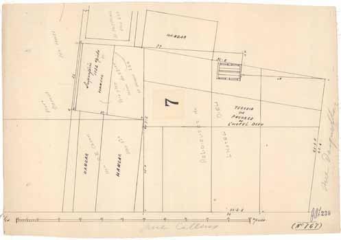 Plans des terrains au coin des rues Collins et d'Aiguillon appartenant aux religieuses de l'Hôtel-Dieu, à messieurs: R.E. Caron, Hoffman, Hall et à la veuve Garant. Indication de la position de plusieurs hangars, noms de rues, de propriétaires et numéros de plans ajoutés au crayon.