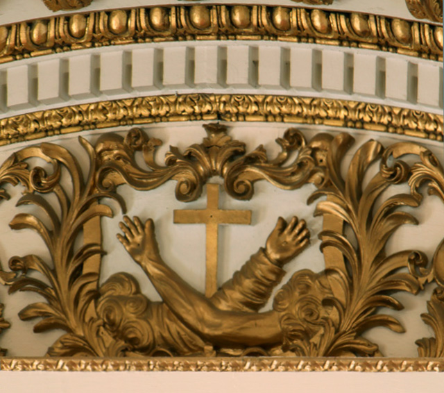 Cette oeuvre est attribuée à Jan Jacques Bloem. En 1811, le conseil de fabrique va acheter le retable sur lequel le tabernacle (92691.77) était adossé et qui provient aussi de l'église des Récollets. Ce décor mural aurait été exécuté par le sculpteur flamand Jan Jacques Bloem dit Leblond en 1713. Bloem se serait installé à Trois-Rivières vers 1716. Selon une tradition orale, ces pièces de grande valeur auraient été données aux Récollets par Louis XIV, qui les destinait à une chapelle du château de Versailles. L'emblème des Récollets (communauté originaire des franciscains), formé des bras entrecroisés du Christ et de saint François se retrouve au centre supérieur du retable. (Source locale)