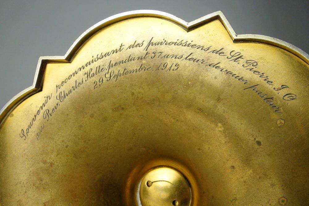 Autour du noeud : IESUS. Sous le pied : Souvenir reconnaissant des paroissiens de St. Pierre I. O. / au Rev. Charles Hallé pendant 37 ans leur dévouer pasteur / 29 Septembre 1913