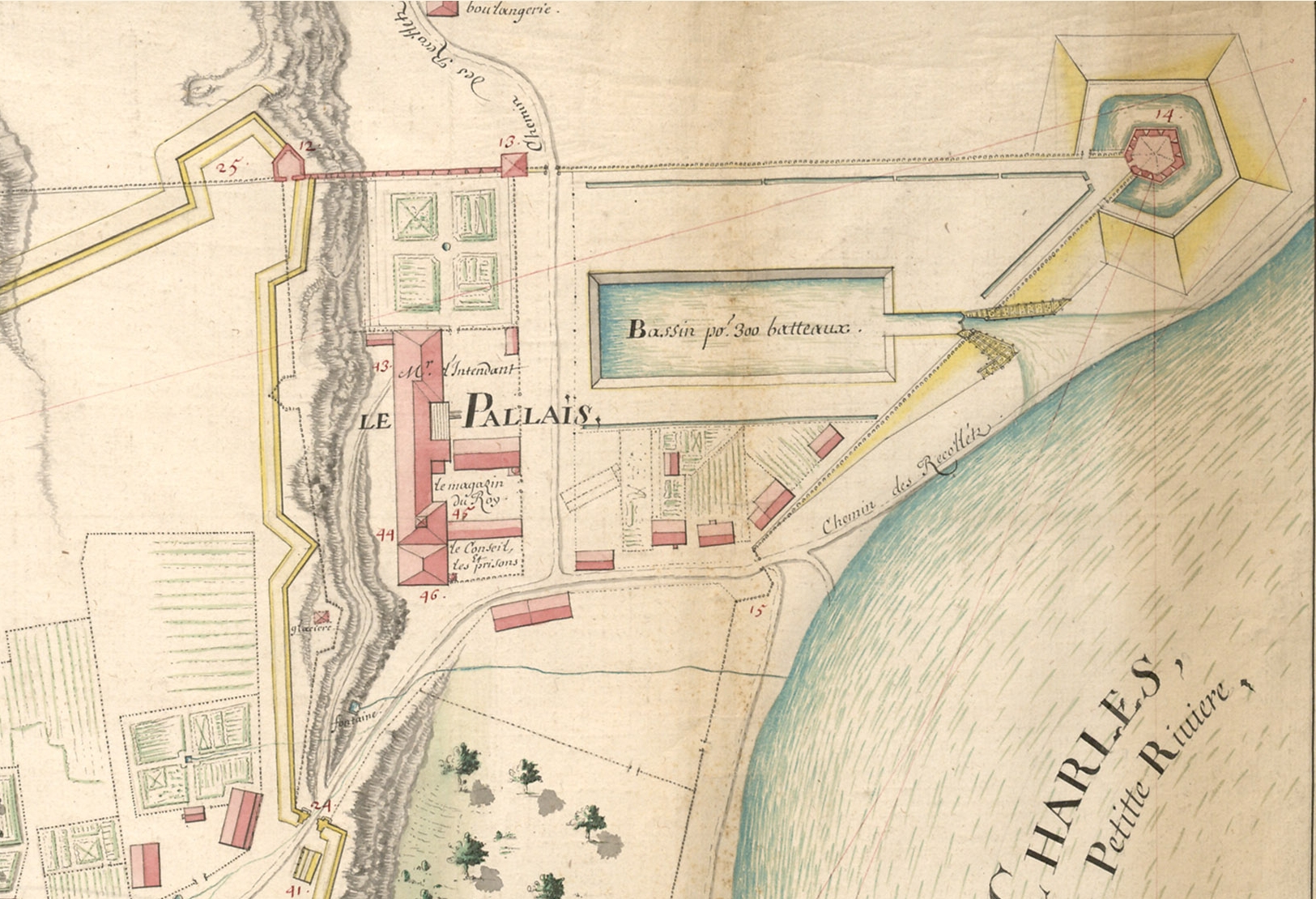 En Nouvelle-France, le palais de l'intendant occupe plusieurs rôles. Il héberge tout d'abord jusqu'en 1759 onze des quinze intendants de la colonie et leur famille. L'intendant, troisième figure en importance dans la colonie après le gouverneur et l'évêque, s'y occupe de la justice, de l'ordre public et des finances. Le palais accueille ensuite les réunions du Conseil souverain, organe de l'administration coloniale créée en 1663 jouant principalement un rôle de tribunal d'appel civil et criminel. Les audiences de la Prévôté de Québec, premier palier de justice dans la colonie, sont aussi tenues au palais par son responsable, le lieutenant-général. Enfin, plusieurs cachots où sont détenus les prisonniers en attente de leur sentence ou purgeant ces dernières, sont aménagés dans la portion est de l'édifice. La justice coloniale est pour ainsi dire centralisée au palais de l'intendant. En y ajoutant les magasins du roi et toute l'activité économique impliquée, le site du palais dépasse largement sa fonction résidentielle et devient « […] l'outil par lequel l'intendant exerce son pouvoir et réalise les dessins qu'il a pour la colonie. » Particulièrement vulnérable au feu, le palais de l'intendant est presque complètement détruit par un incendie le 5 janvier 1713. On ordonne aussitôt la construction d'un nouveau palais au nord-ouest des ruines.