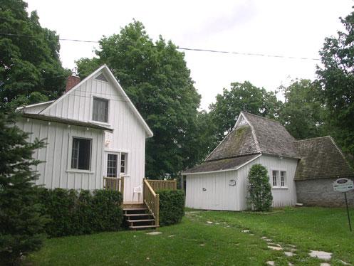 - les composantes de la remise, dont le plan rectangulaire, l'appentis, l'annexe en pierre, les petites fenêtres à carreaux et le toit à quatre versants;
