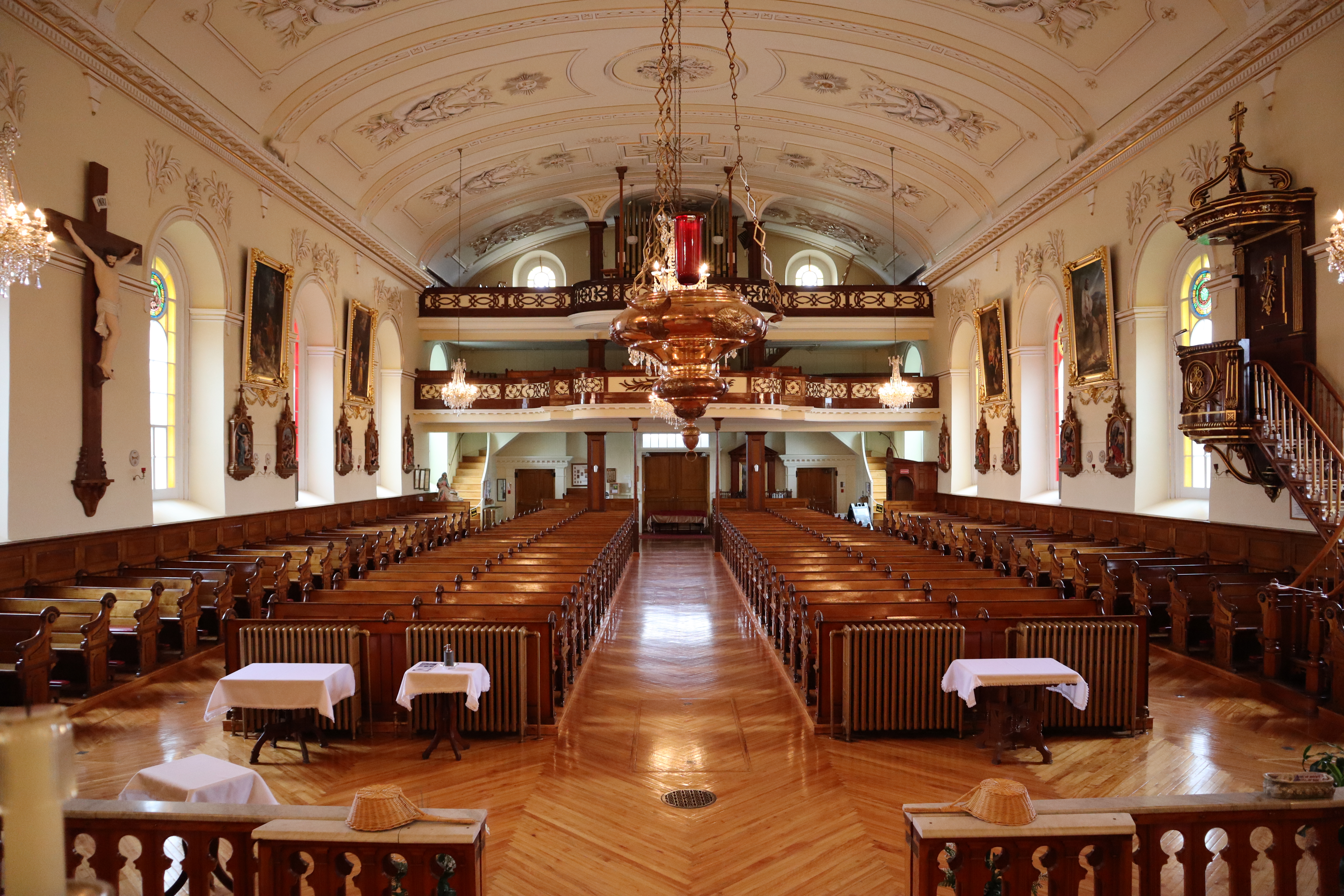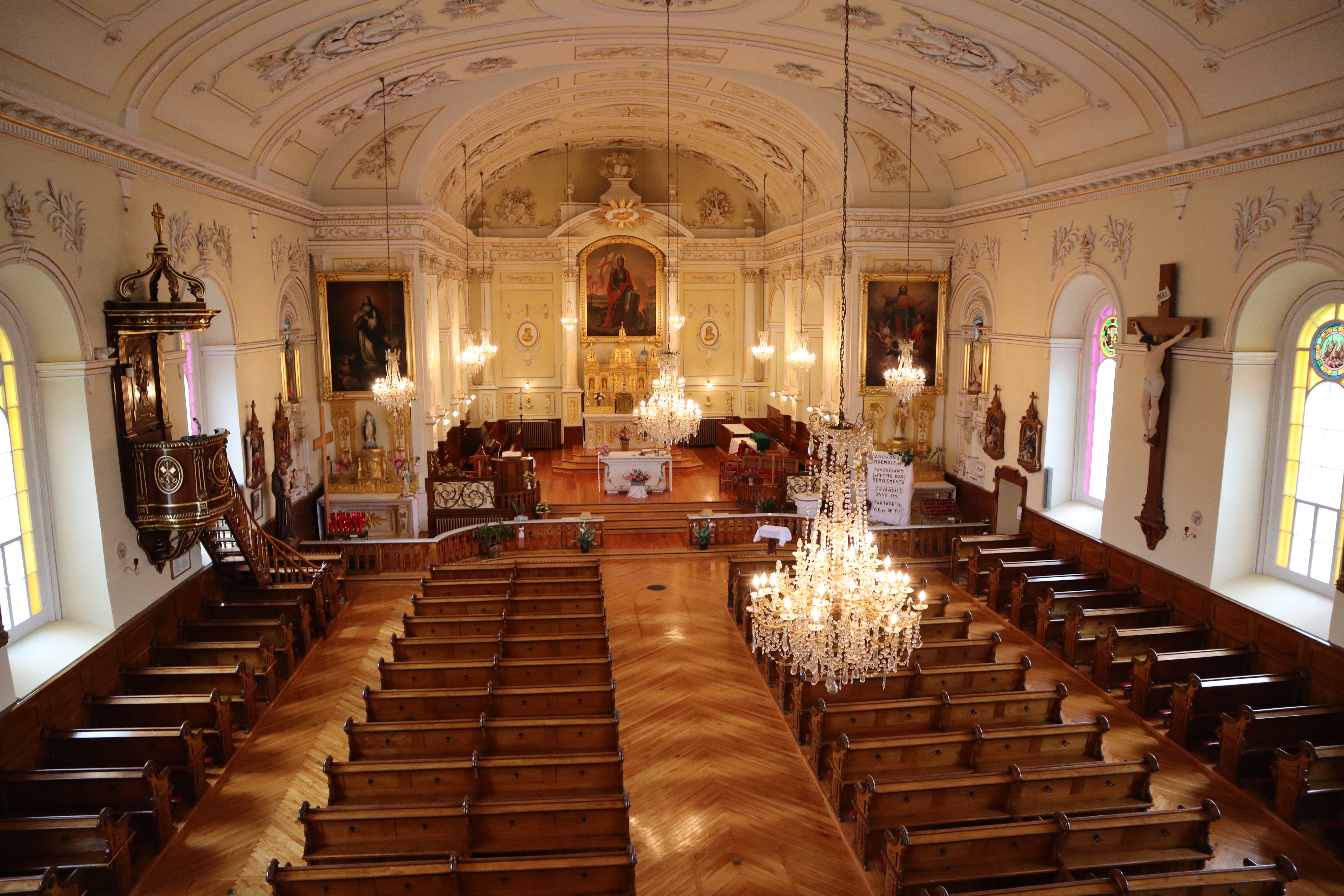 - les éléments du décor intérieur, dont la fausse voûte en arc surbaissé dans la nef et en berceau dans le choeur rythmée par des arcs doubleaux et ornée de gloires (François-Xavier Berlinguet, 1852-1858) et de quatorze trophées aux instruments de la Passion (David Ouellet, fin du XIXe siècle), les tribunes au garde-corps orné de rinceaux (Berlinguet) et les planchers de bois;
