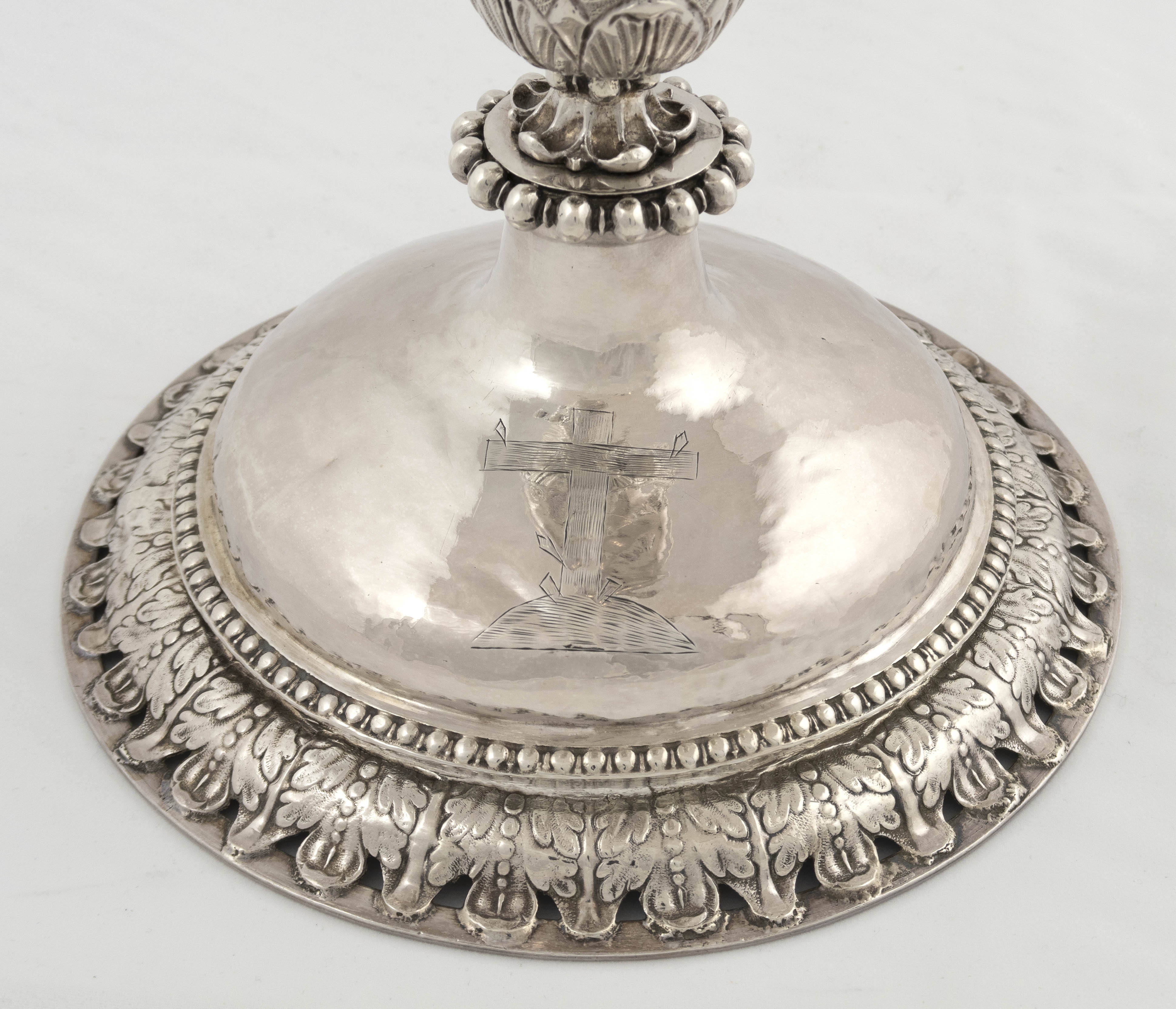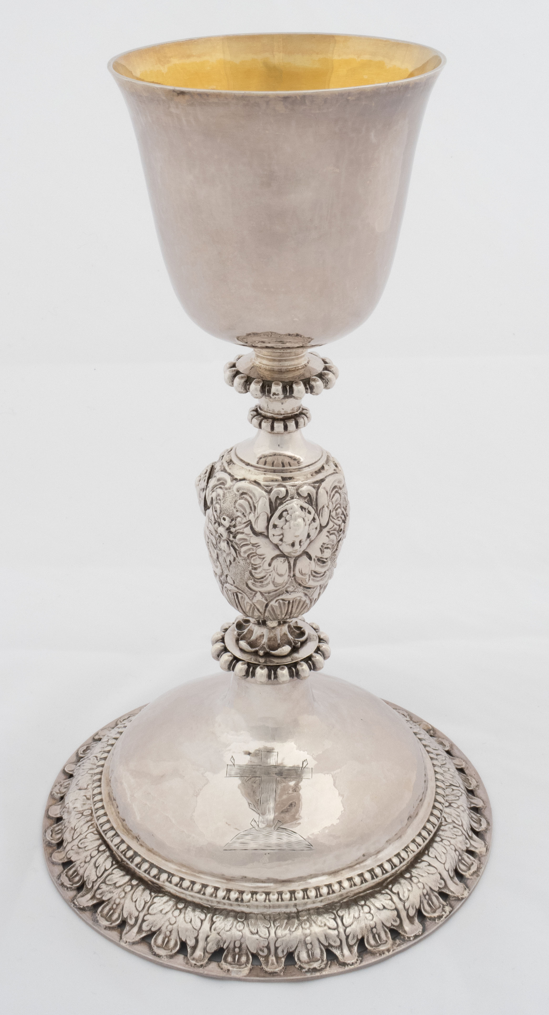 Calice entièrement en argent à l'exception de l'intérieur de la coupe qui est en vermeil. Il est muni d'une coupe sobre et d'un pied circulaire orné d'une frise de feuilles d'acanthe ajourée sur son pourtour, surmontée d'une frise de petits godrons. La terrasse est polie, à l'exception d'un ornement gravé : une croix posée sur un petit monticule semi-circulaire, qui évoque le sacrifice de Golgotha. Le nœud du calice est ovoïde et présente une ornementation usuelle pour l'époque, soit trois têtes ailées en alternance avec autant de bouquets.